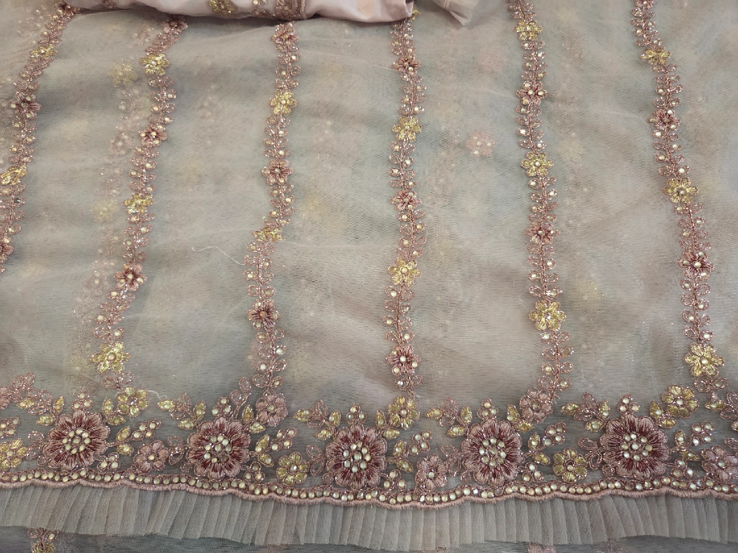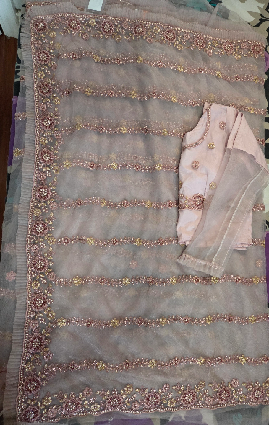 Brand new net saree with beautiful floral embroidery in golden and pink tones. Perfect for weddings, parties, and special occasions. Lightweight & stylish Embroidered border with detailed work Elegant design adds a royal touch Condition: Brand new
