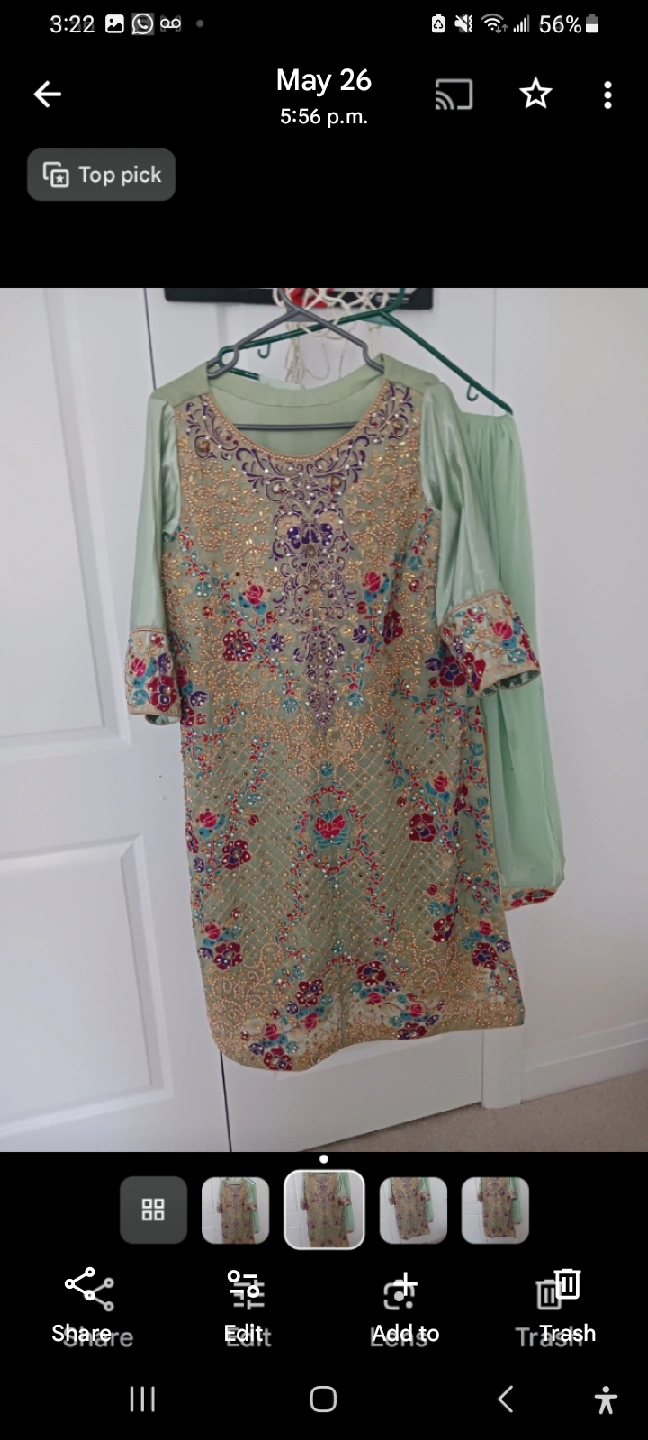 Beautiful, traditionally styled salwar kameez suit with intricate embroidery. The light green colour is lovely, and the embroidery features floral designs in pink, purple, and gold. Perfect for a special occasion!