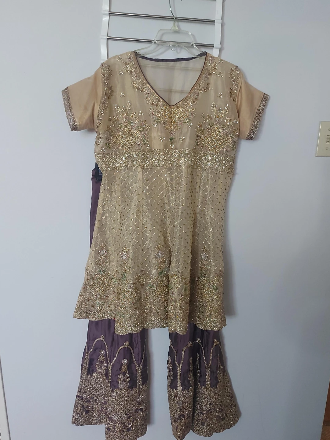 75Selling a beautiful salwar kameez suit with intricate embroidery. The top is a lovely beige colour with gold detailing, and the bottoms are a rich purple with matching embroidery. It's in great condition and ready for a new home!