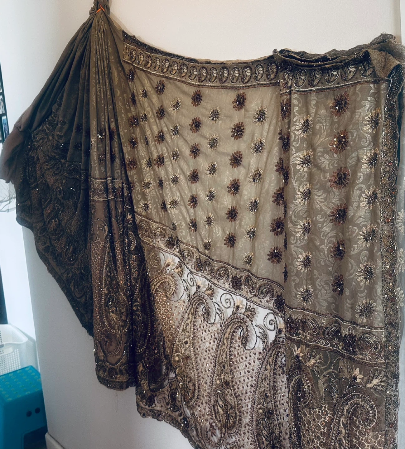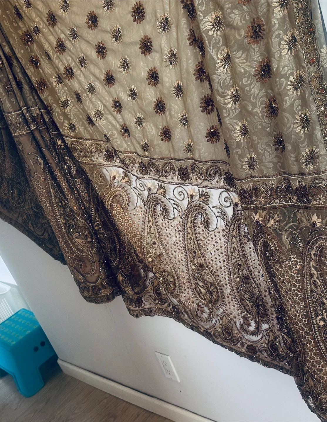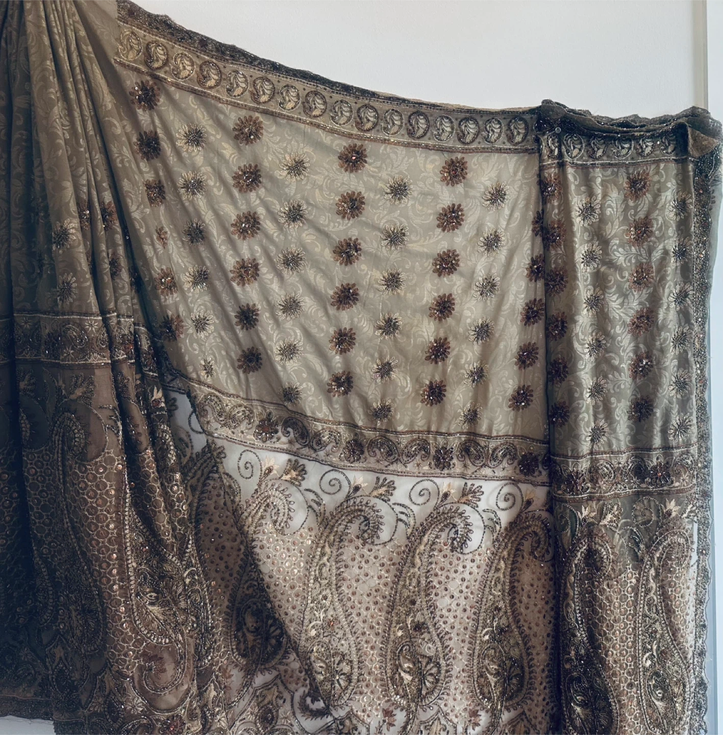 Beautifully embroidered sari with intricate detailing and a unique design. Perfect for special occasions or adding a touch of elegance to your wardrobe beads work & dabka work one time wear