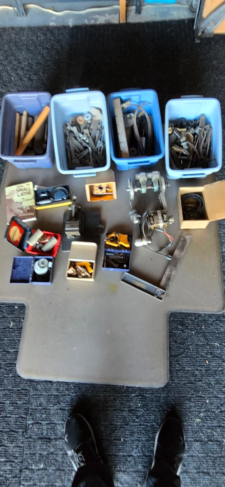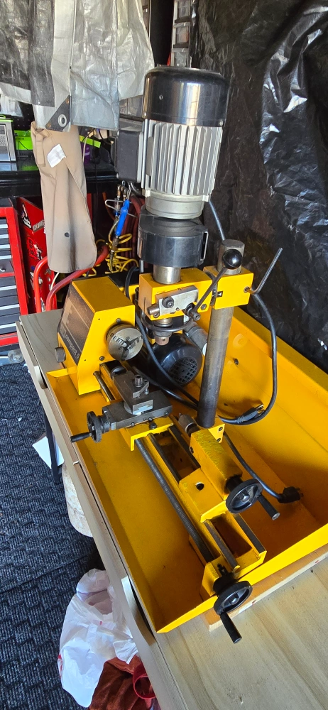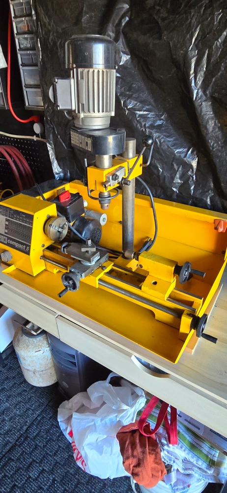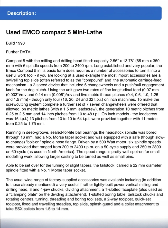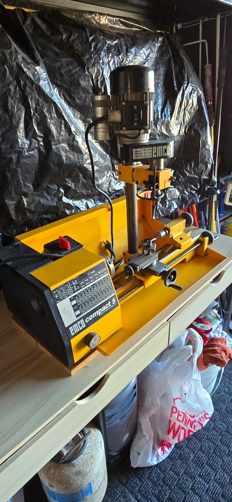 Selling a used EMCO Compact 5 Mini-Lathe with a milling and drilling head. This lathe was built in 1990. Capacity: 2.56" x 13.78" (65 mm x 350 mm) with 6 spindle speeds from 200 to 2400 rpm. It is equipped with a 500 Watt motor, six spindle speeds provided that ranged from 200 to 2400 r.p.m. on a 50-cycle supply and 250 to 2800 on 60-cycle (as used in North America). Accessories include vertical milling and drilling head, 3 and 4-jaw chucks, dividing attachment, a T-slotted faceplate, tailstock chucks and rotating centres, turning, threading and boring tool sets, a 2-way toolpost, quick-set toolpost, fixed and travelling steadies, top slide, splash guard and a collet attachment to take ESX collets from 1.5 to 14 mm