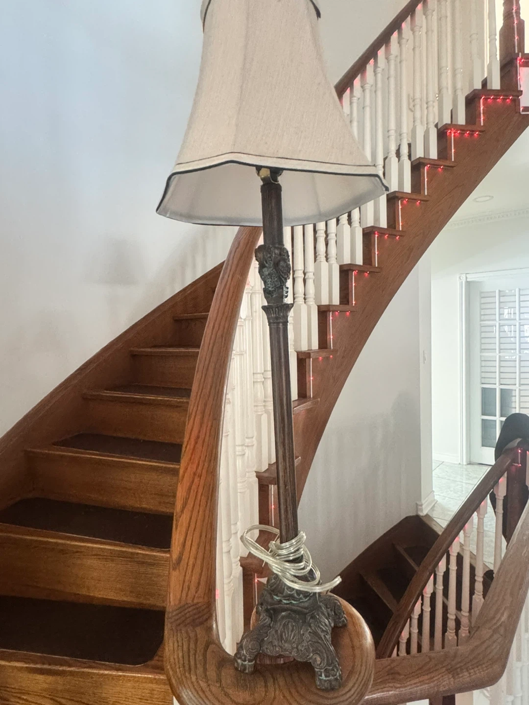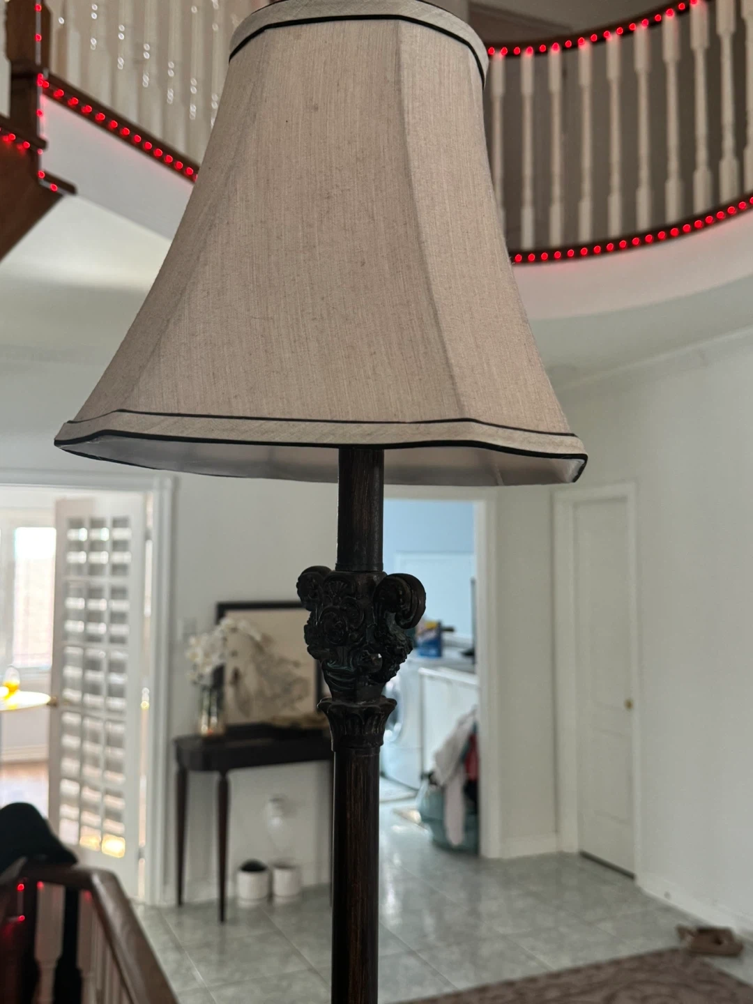 This table lamp features a classic beige fabric shade with dark trim. It has an ornate, antique-style bronze base with intricate detailing. Perfect for adding a touch of vintage charm to any room!