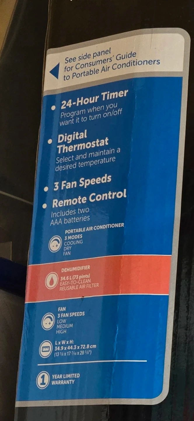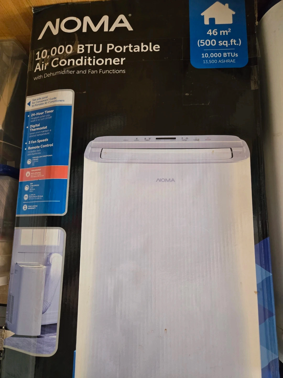 This NOMA portable air conditioner offers 10,000 BTU cooling power and includes dehumidifier and fan functions. It features a 24-hour timer, digital thermostat, 3 fan speeds, and comes with a remote control. The unit's dimensions are 34.9 x 44.3 x 72.8 cm.
