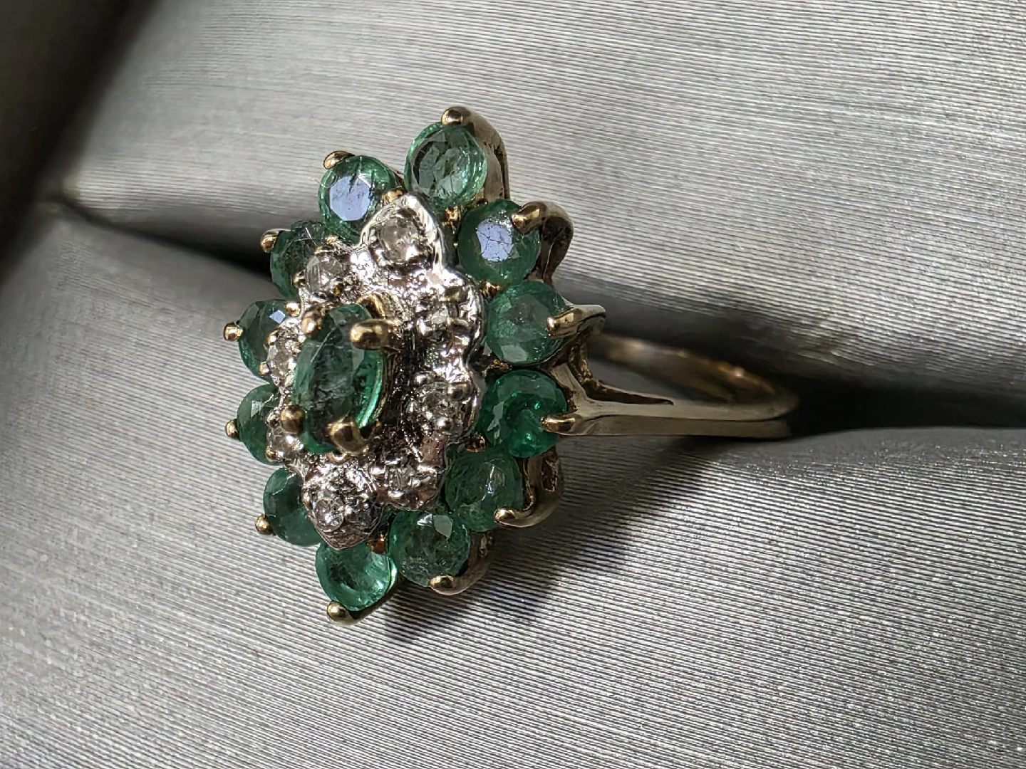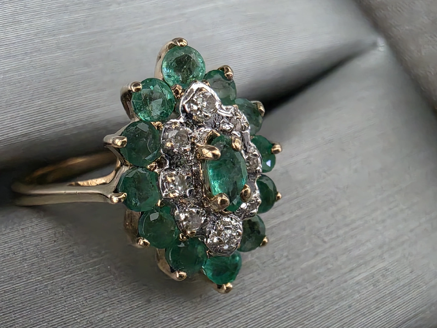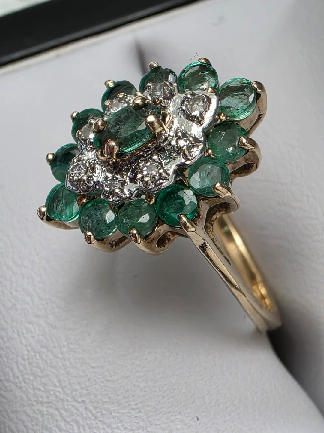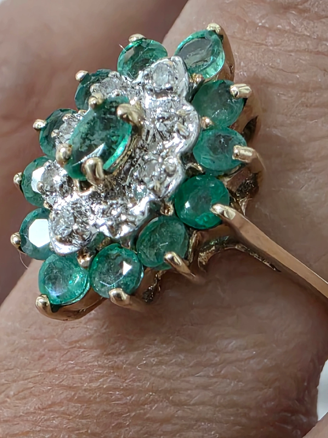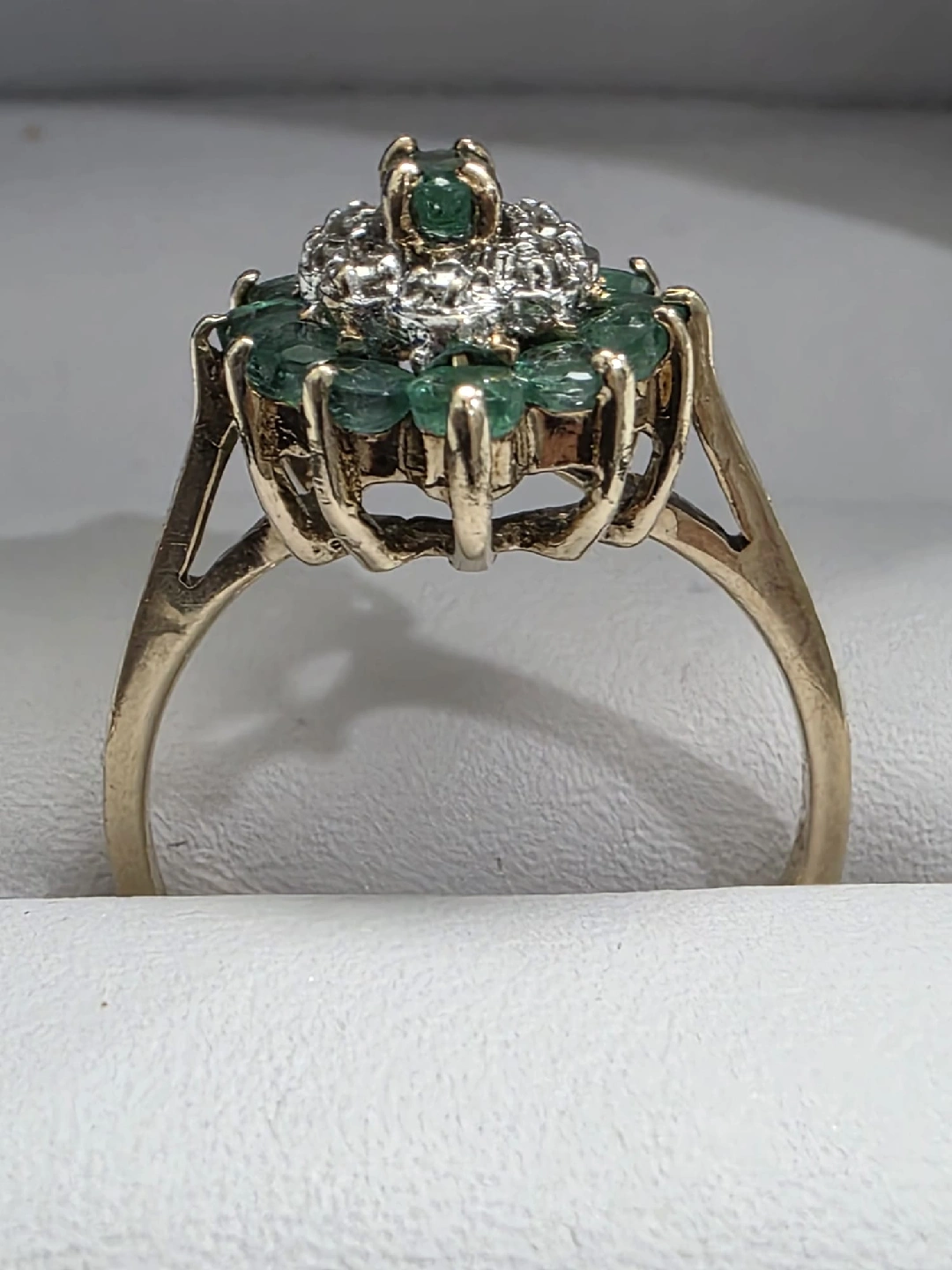 Beautiful emerald and diamond ring. The ring features a cluster of round emeralds surrounding a smaller cluster of diamonds, set in a gold band. It's in great condition and ready for a new home! 10k yellow gold ๐