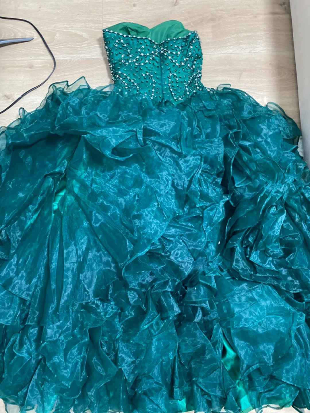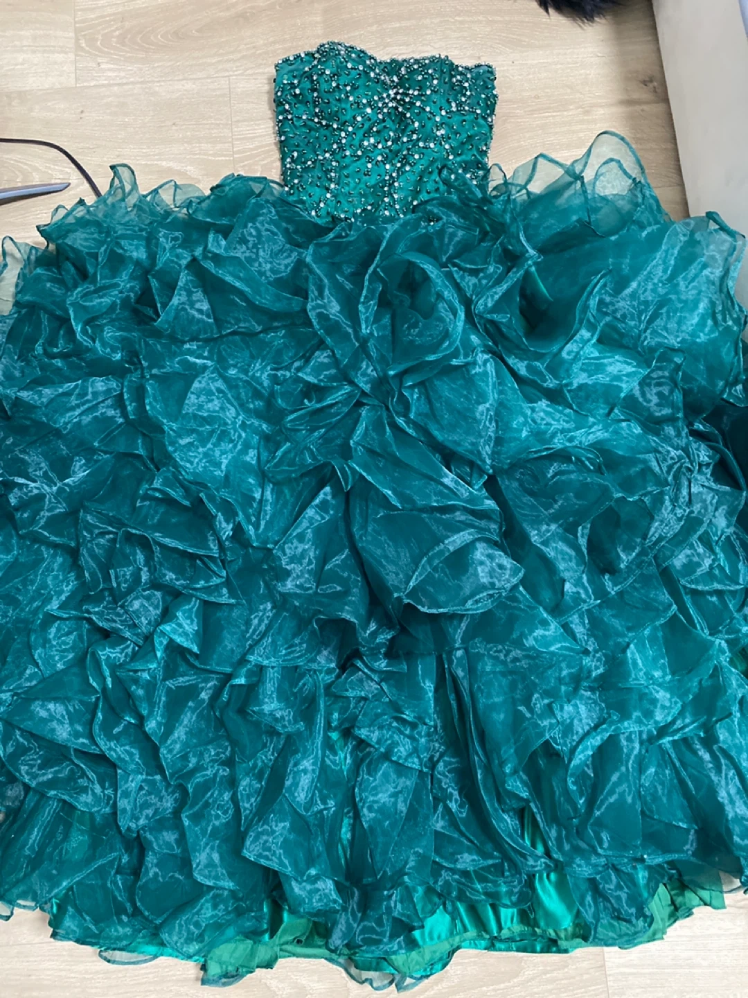 Selling a beautiful emerald green formal dress! It features a beaded bodice and a layered, ruffled skirt. The dress appears to be in good condition and would be perfect for a special occasion. Feel free to ask any questions!