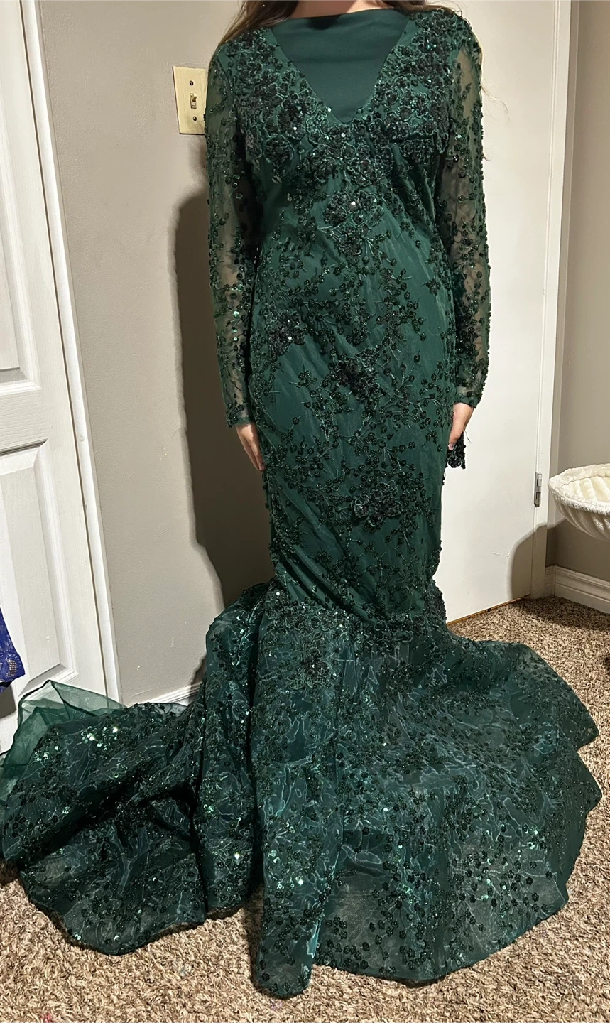 60Beautiful emerald green formal gown, perfect for a special occasion! It features long sleeves and intricate beaded detailing. The gown has a mermaid silhouette with a flowing train. It’s in great condition and ready to make someone feel like a princess. Bought it for around 400 dollars.