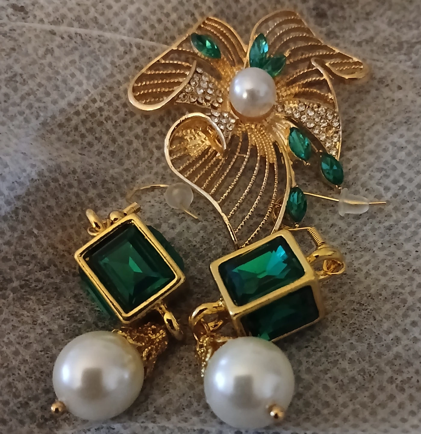1000+Selling a lovely set of emerald and pearl earrings and a brooch. The earrings feature a gold-tone setting with a square-cut emerald-coloured stone and a pearl drop. The brooch is a gold-tone floral design with pearl and emerald accents. A beautiful addition to any jewellery collection!