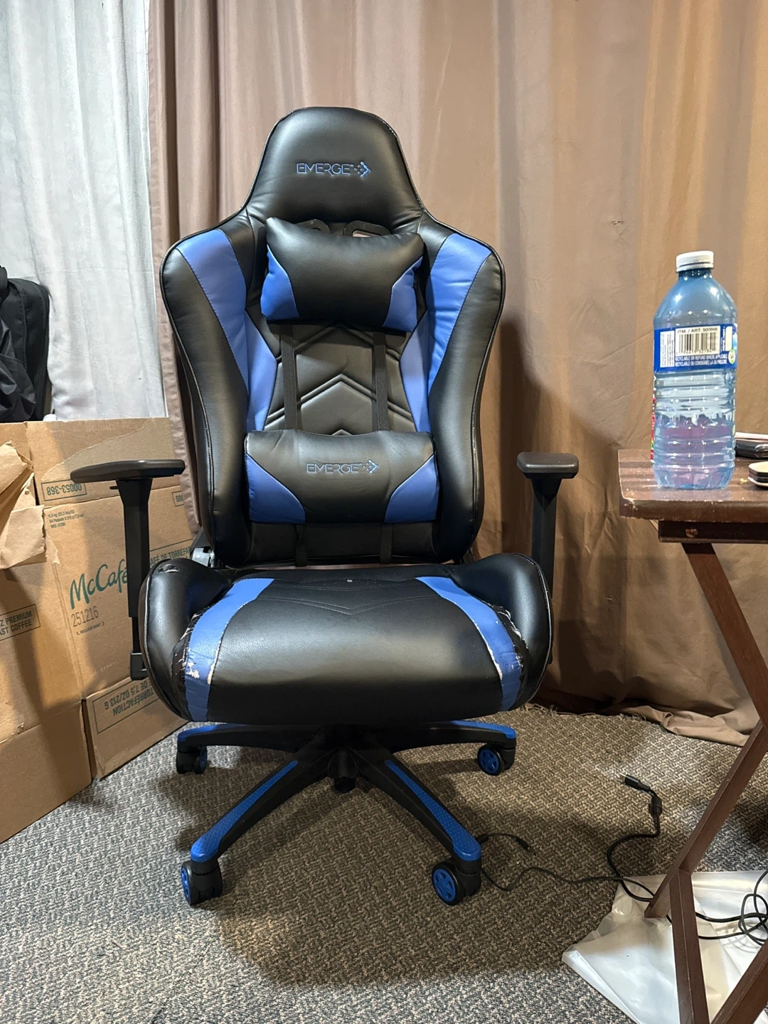 Selling a black and blue Emerge gaming chair. It's got some wear and tear on the seat, and the arm is loose as you can see in the photos, but it's still comfy and functional for gaming or working from home