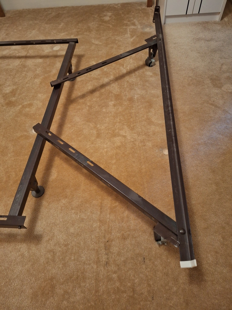 Heavy duty durable steel frame, easily switch sizes from twin/full/queen to fit your space. Wheels are convenient to move the bed as needed, great condition!