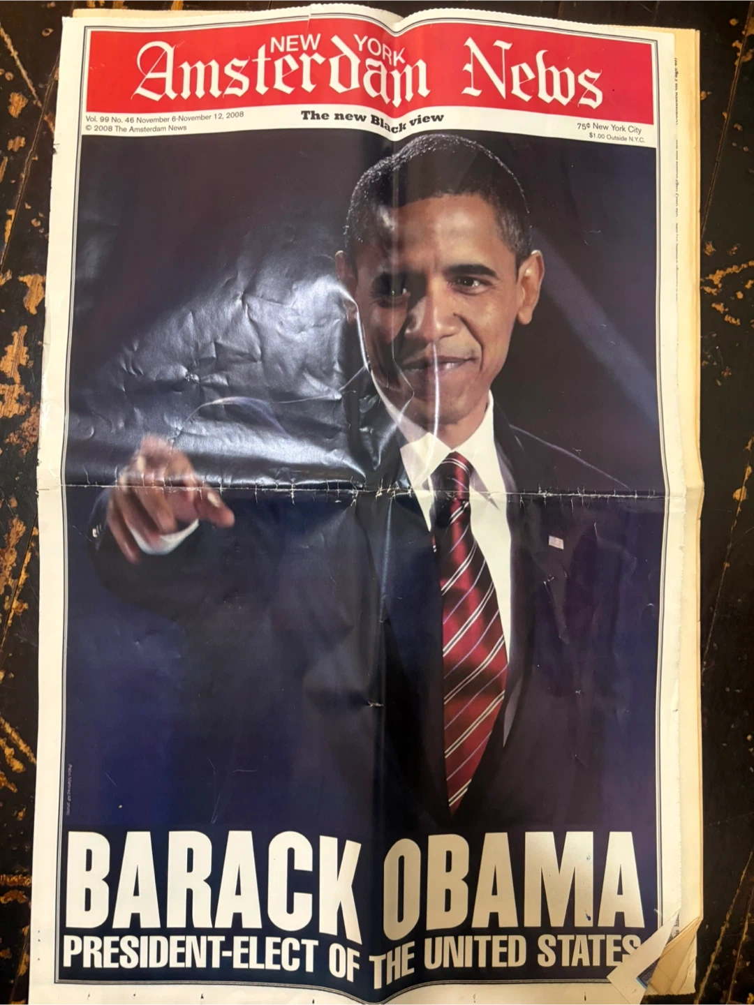 This is a special edition of the New York Amsterdam News from November 6, 2008. It features coverage of Barack Obama's election as President. The newspaper includes photos and articles about the historic event. It's a collector's item for those interested in political history.