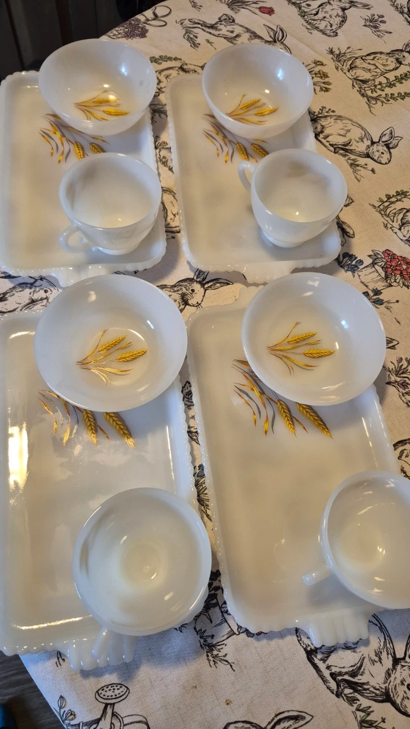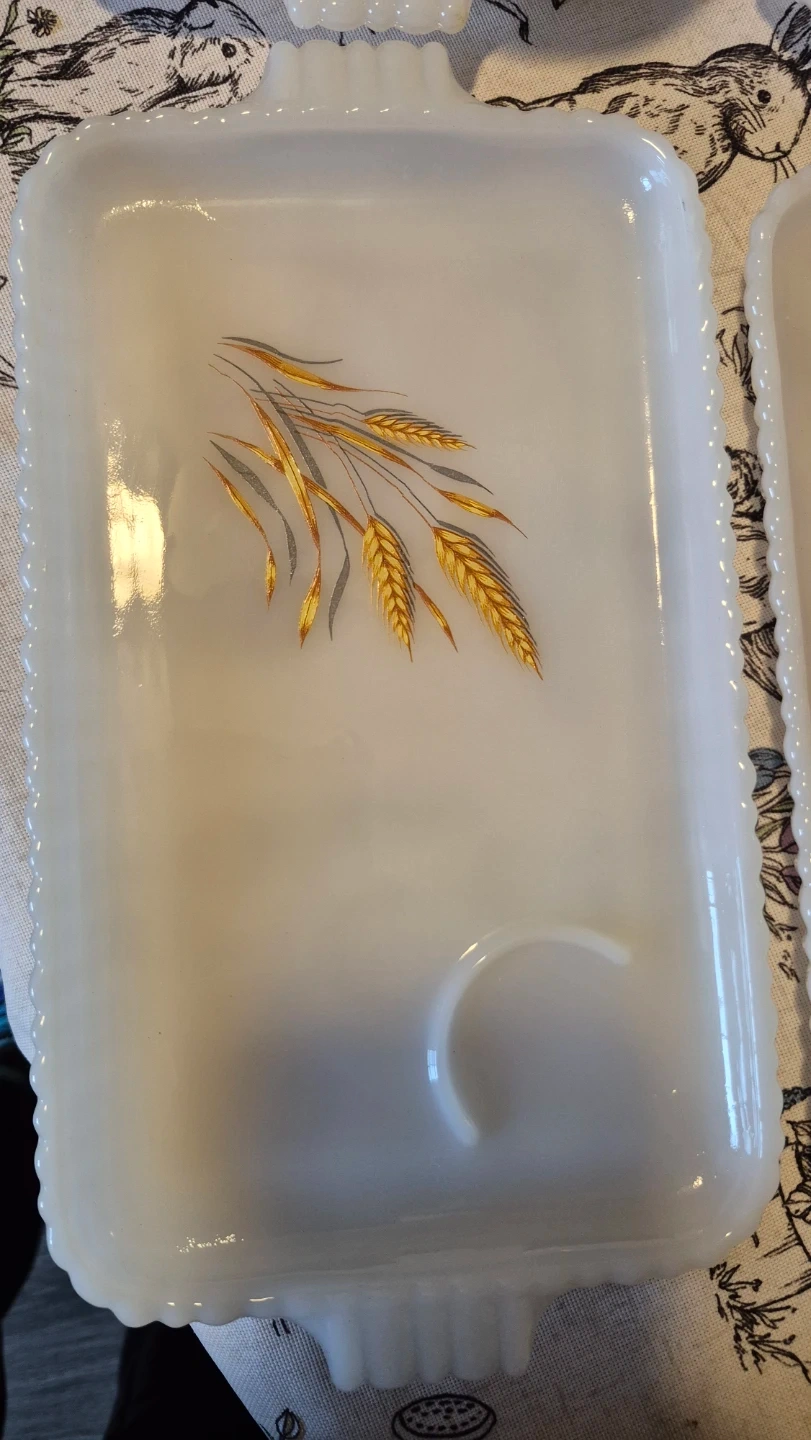 This is a set of milk glass serving pieces featuring a delicate wheat stalk design. It includes several bowls and rectangular trays. Milk glass material.