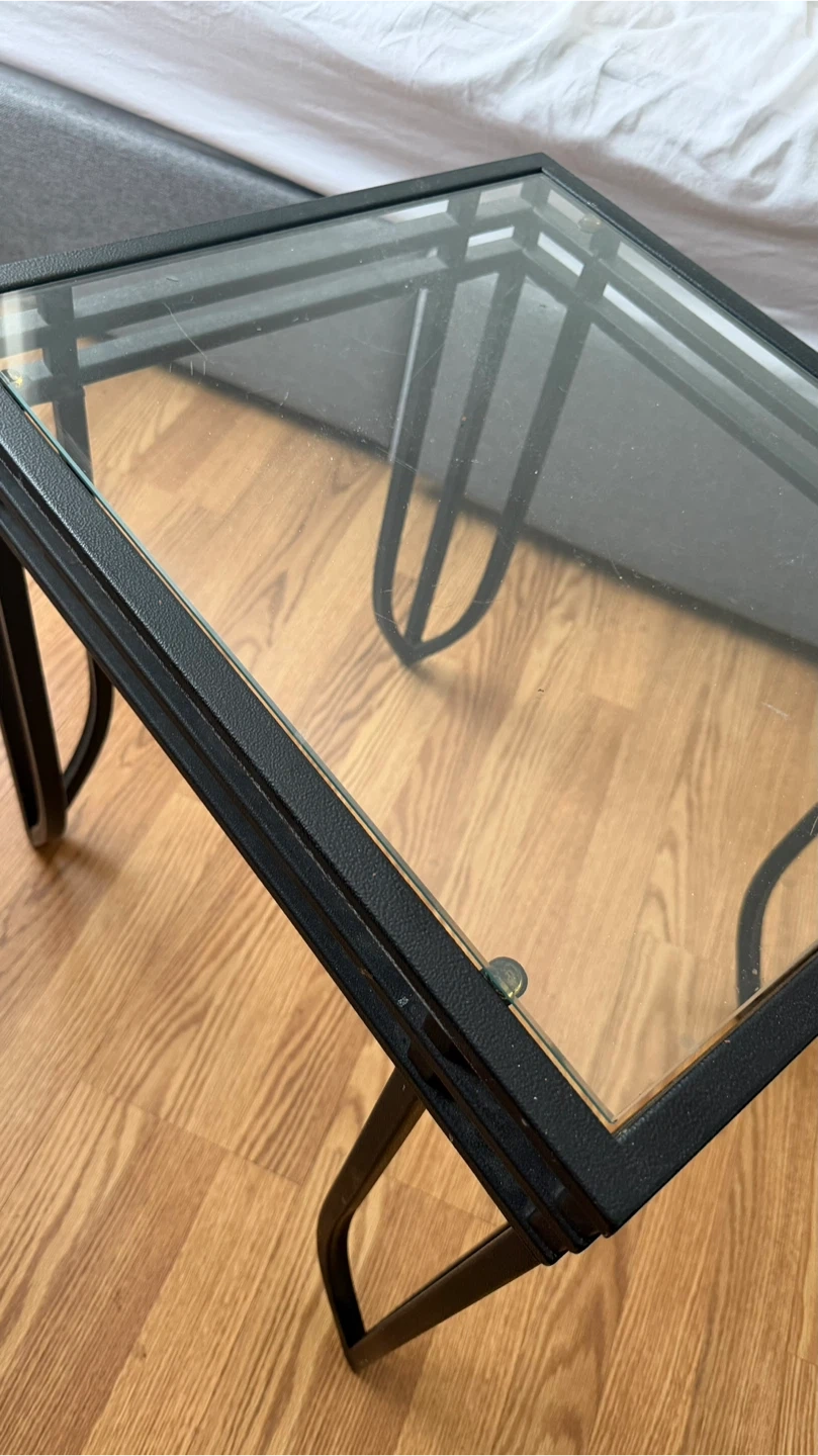 A square end table with a black metal frame and a glass top. It's got a modern design with curved legs. This table's compact size makes it handy for placing next to a couch or chair.