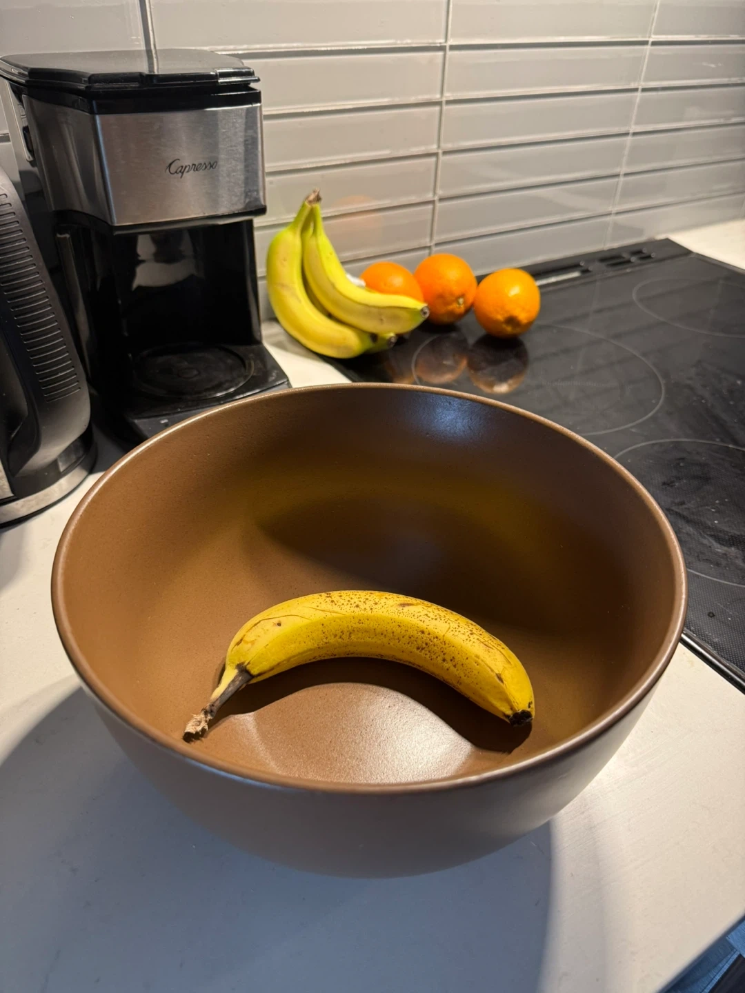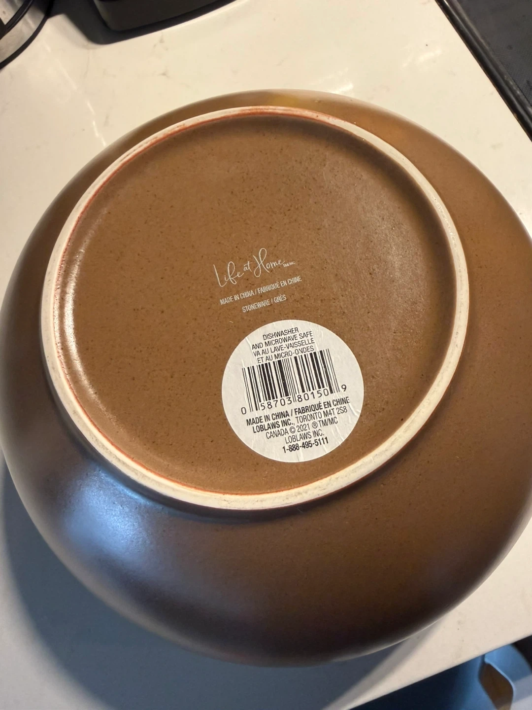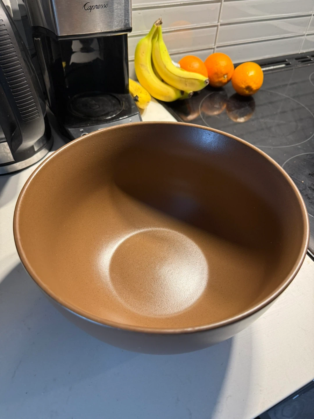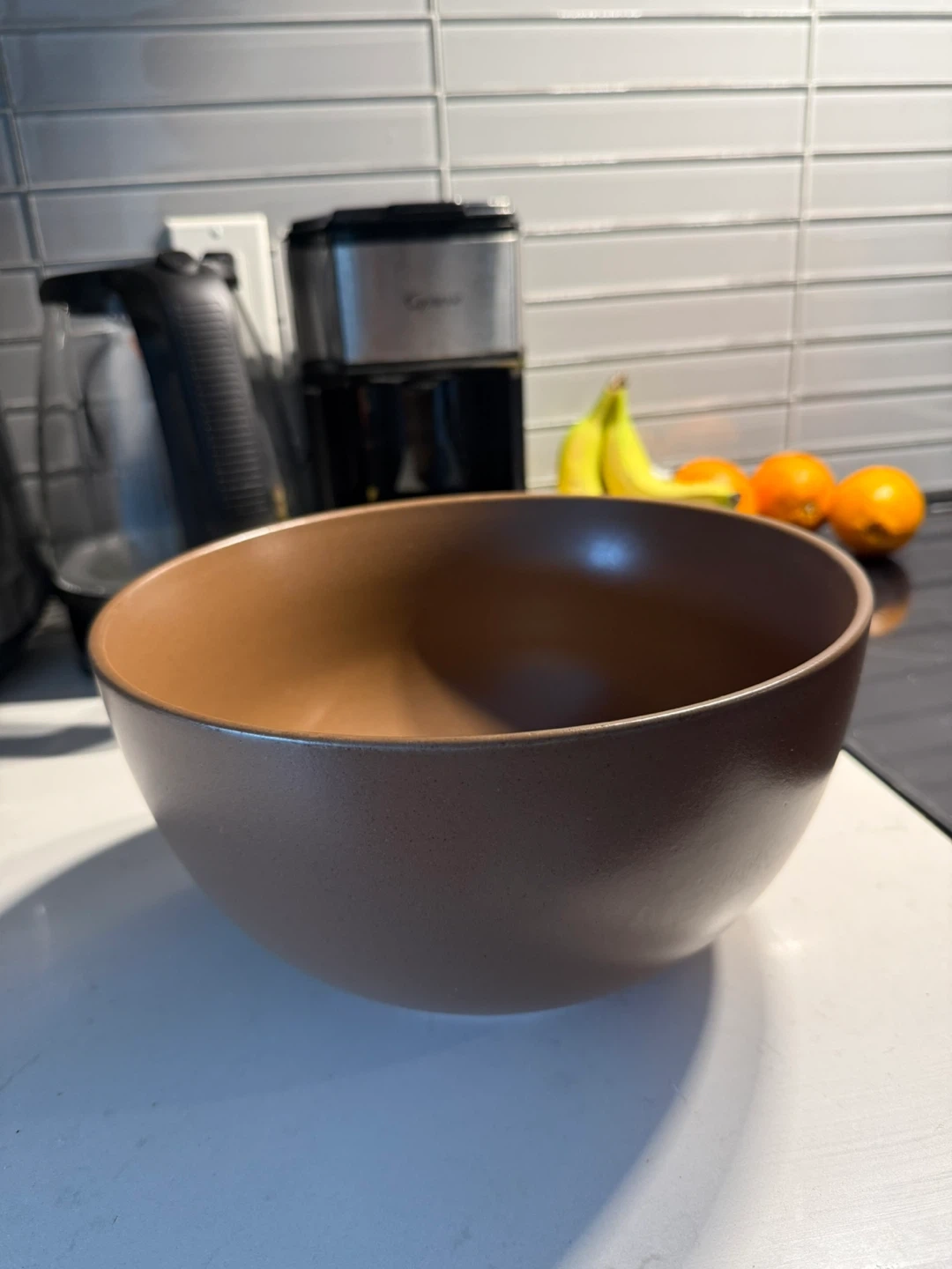 A medium-sized serving bowl in a brown hue. It's dishwasher and microwave safe. This bowl is perfect for serving snacks or salads to your guests!