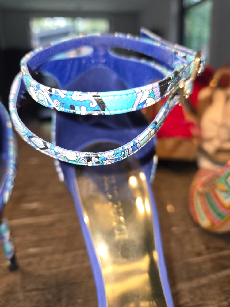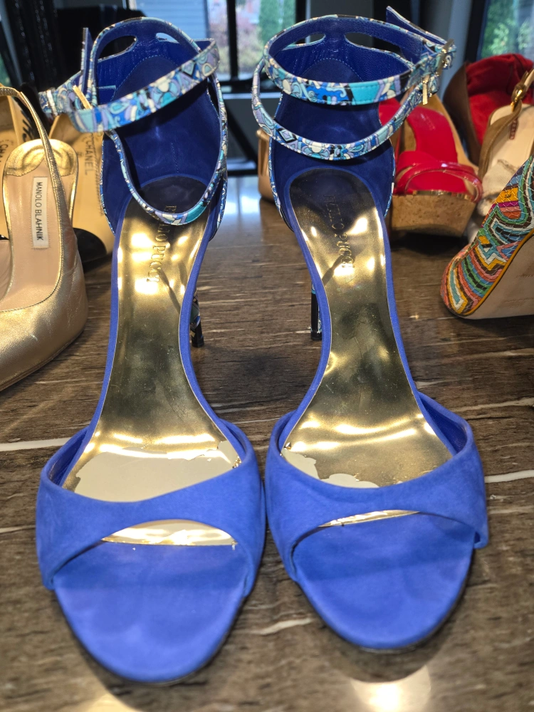 205Selling a pair of stylish Emilio Pucci heels! They're a beautiful blue suede with a unique patterned ankle strap. Perfect for adding a pop of colour to your outfit!