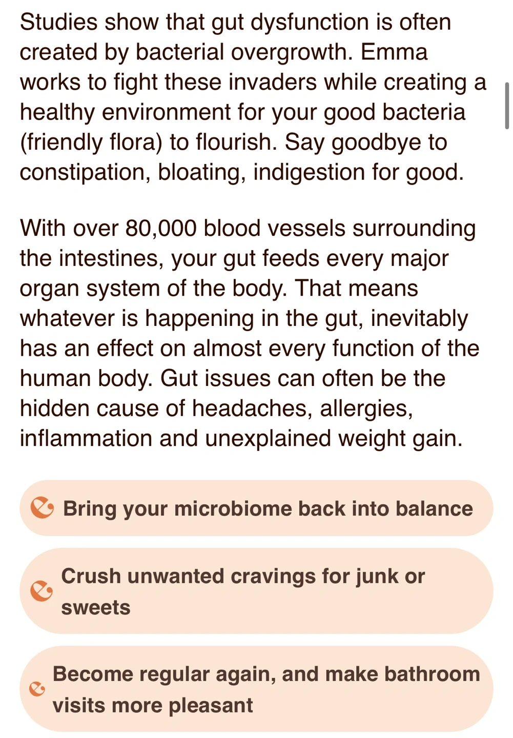 I'm selling Emma Daily Digestive Supplement. It helps with digestion, balance and metabolism. It's designed to help eliminate bacterial overgrowth and restore balance to your microbiome. Give your gut a vacation! Expiry 2028