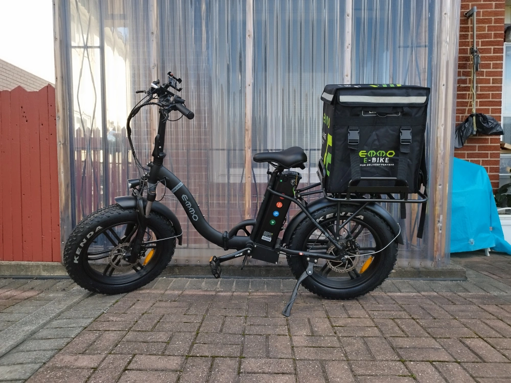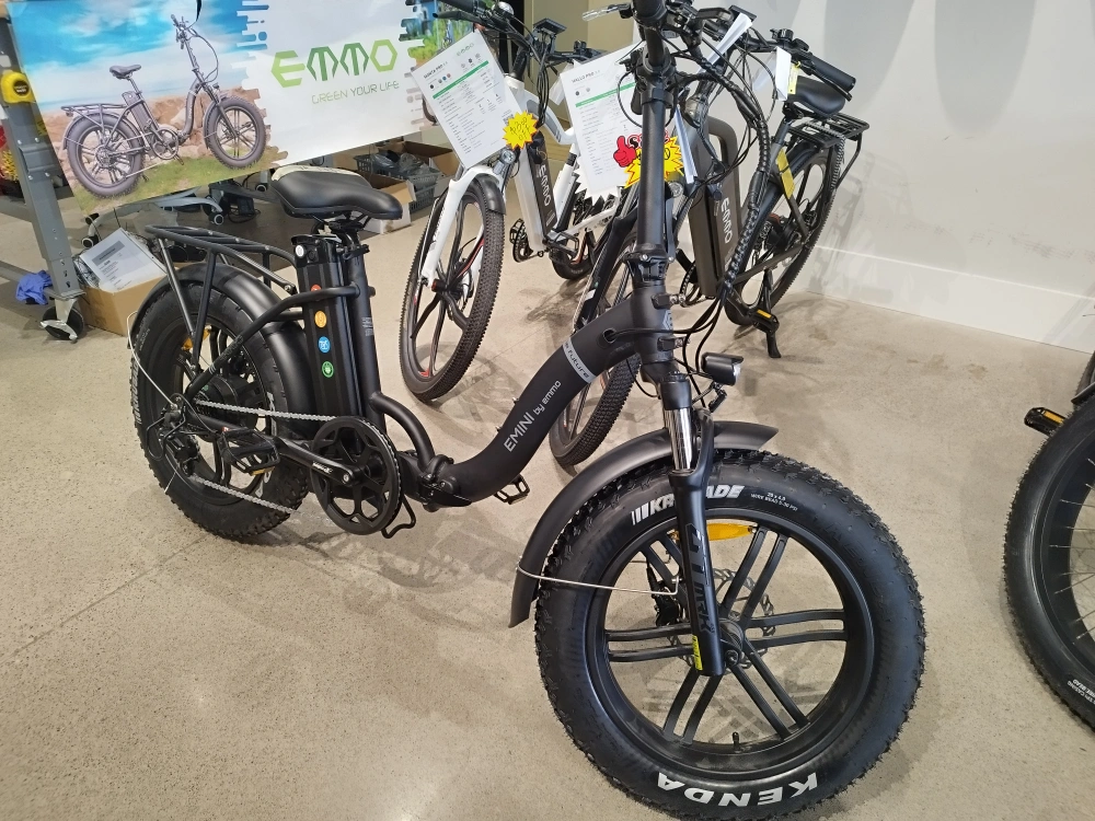 E-Mini Pro 2.0 48V/10Ah Lithium Black electric bike with thick tires and a rear rack. Folds in half for easy storage. Inclusions: Insulator bag Rear rack for the bag Helmet with shades and rechargeable reflector (New) Bike Lock (new) never used Disc brake alarm (never used) Phone holder Bought it last October 7th With receipt and warranty