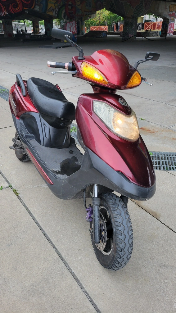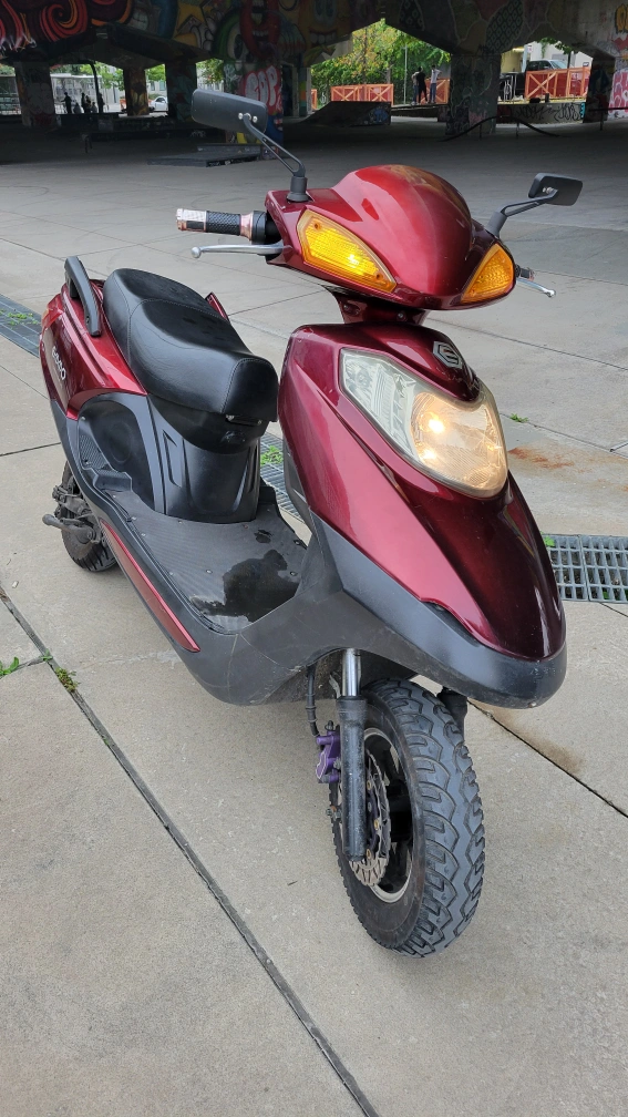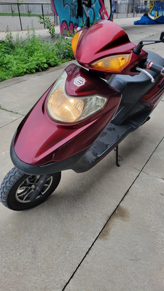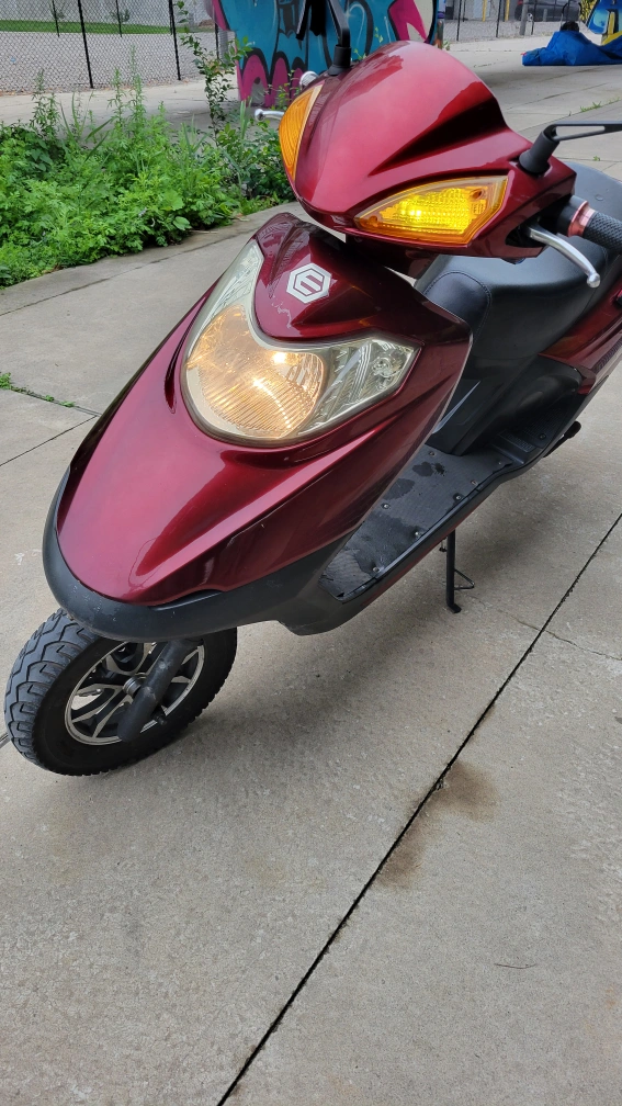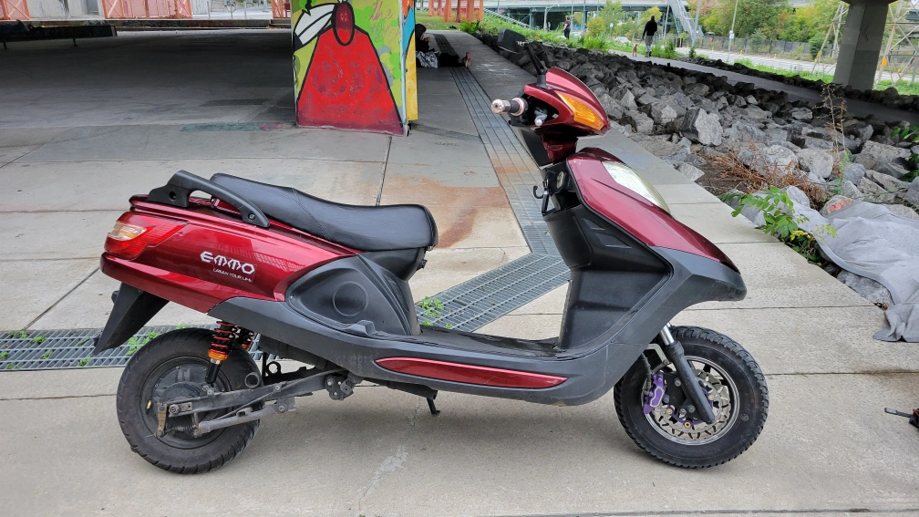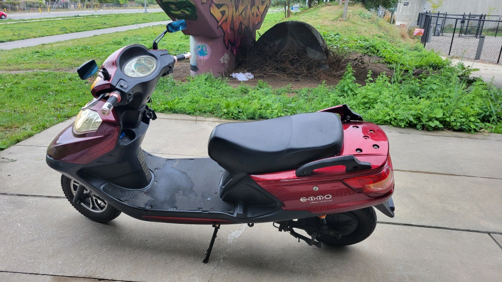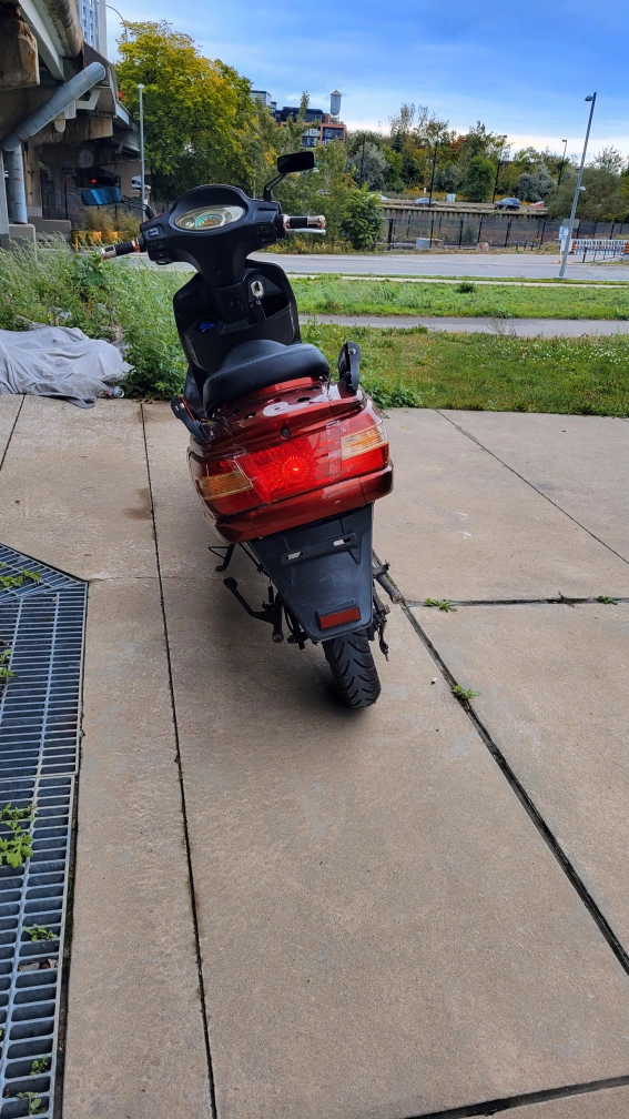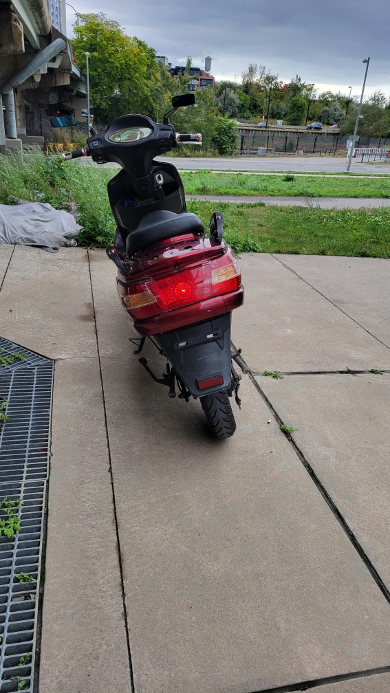 61Electric scooter, burgundy red colour. Good condition. Includes mirrors and lights. Ready to ride. 84v, new back tire, new DC converter, new ignition w/ 2 keys, new shocks and a new chrome back rack. ( I removed the handrails to install the rack, not pictured ) Everything works as it should. Batteries are in good condition and hold a charge. Comes with helmet, 84v SLA charger, rain cover, front disc lock w/2 keys and a chain lock.
