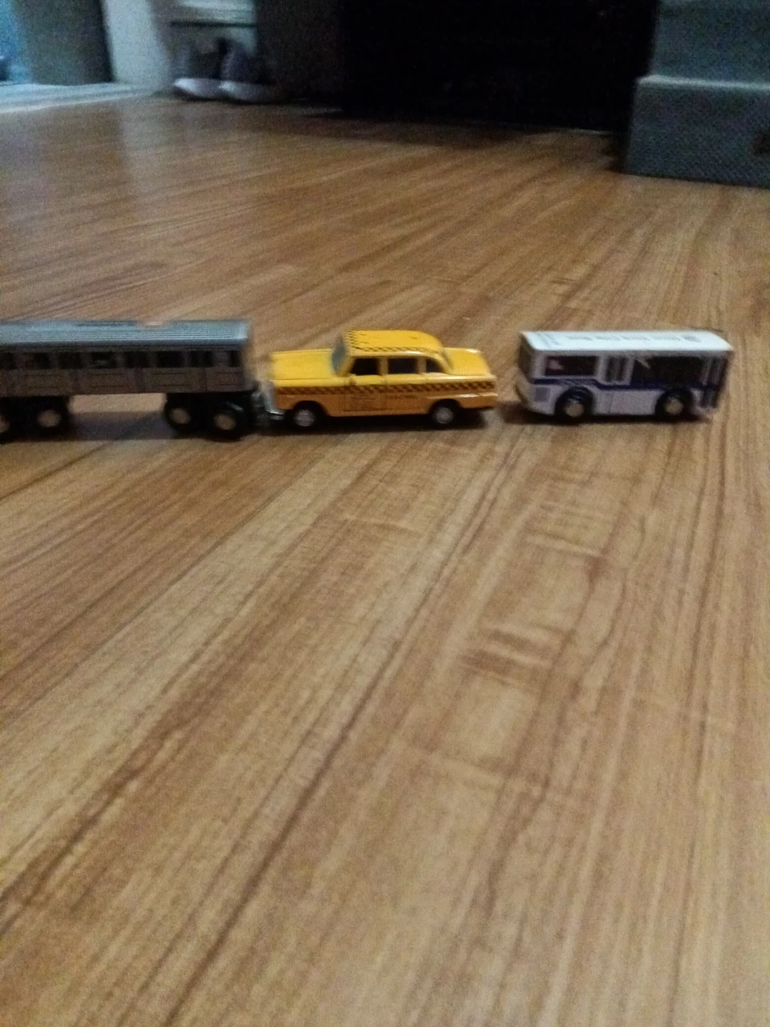 Includes a toy train car, a yellow taxi, and a white and blue bus. These are toy vehicles for imaginative play. Made of durable material.