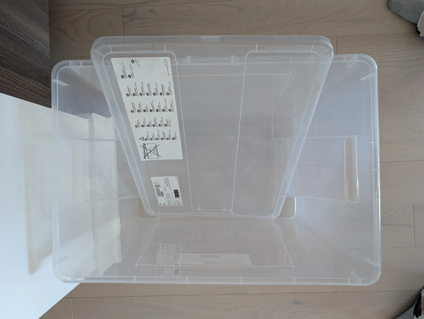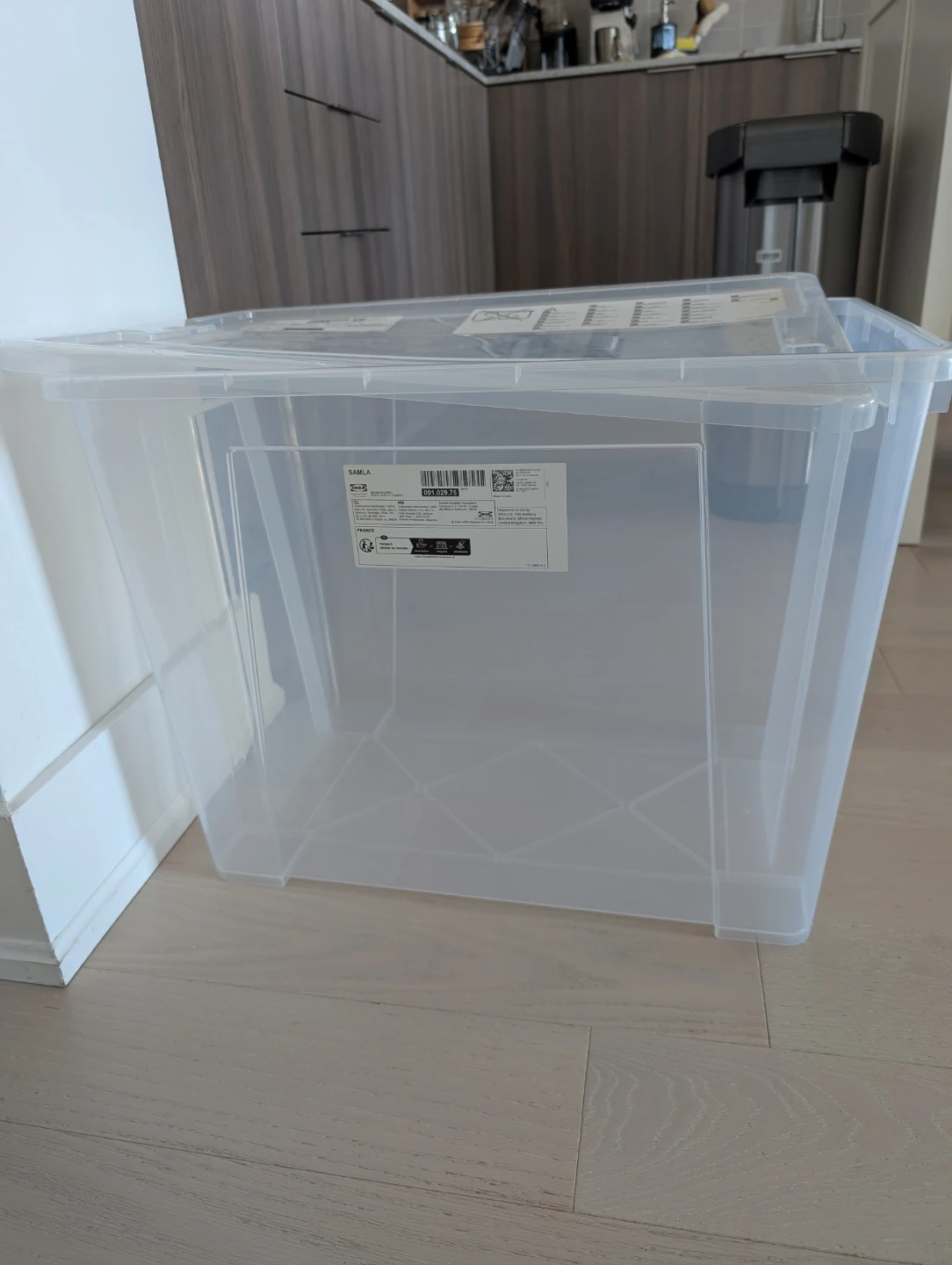 This is an IKEA SAMLA storage box with a lid. It's made of transparent plastic. Dimensions are 57x39x42 cm, with a capacity of 65 L. Selling only because I no longer need it. Original price is 18+tax.