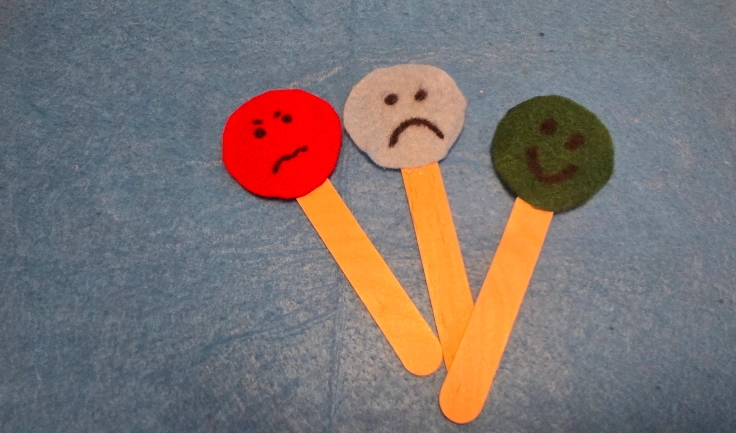 10I created a set of three puppet sticks showing different emotions: angry (red), sad (blue), and happy (green)! These are great for helping kids express their feelings or for classroom activities. This activity helps children to identify their emotions and emotions their peers may be experiencing through interactive play, songs, and stories with these felt puppets.