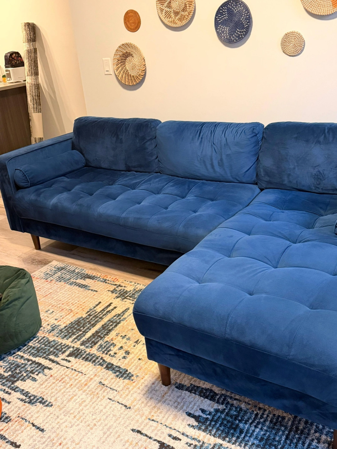 Elevate your living room with this beautiful navy blue velvet sectional! This couch features a classic mid-century modern silhouette with a tufted bench seat, tapered walnut-finish wood legs, and a comfortable right-facing chaise.