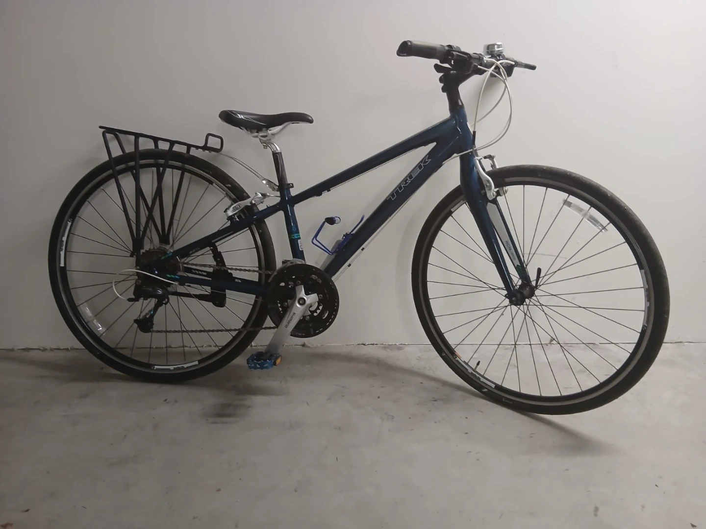 Dark blue Trek FX 2 women's hybrid bike. It's equipped with a rear rack and a water bottle cage. This bike is great for commuting or recreational rides. It's ready for your next adventure!