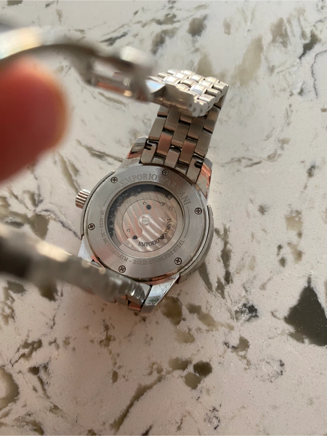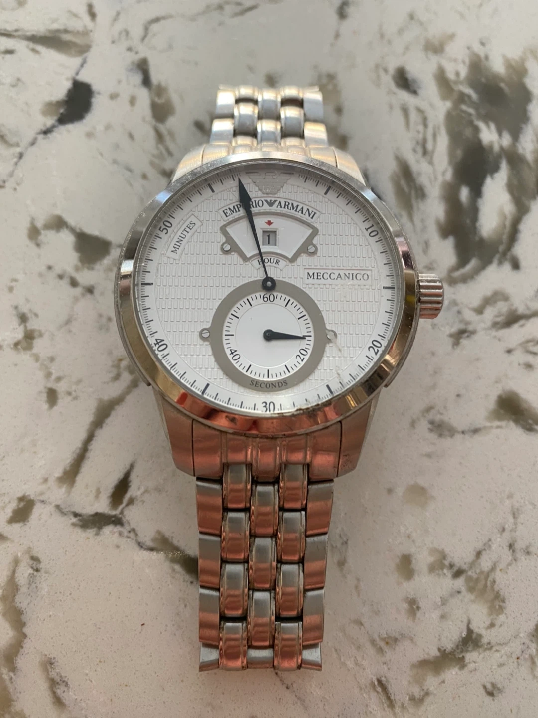 Selling a stylish Emporio Armani Meccanico watch! It has a stainless steel band and a unique dial design. The watch is in good condition and ready to wear. A sophisticated timepiece for any occasion!