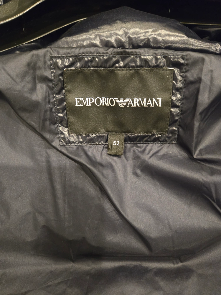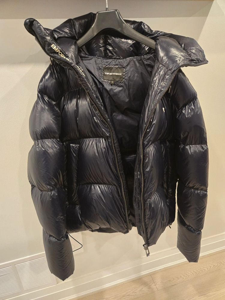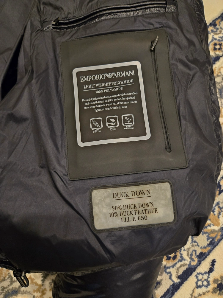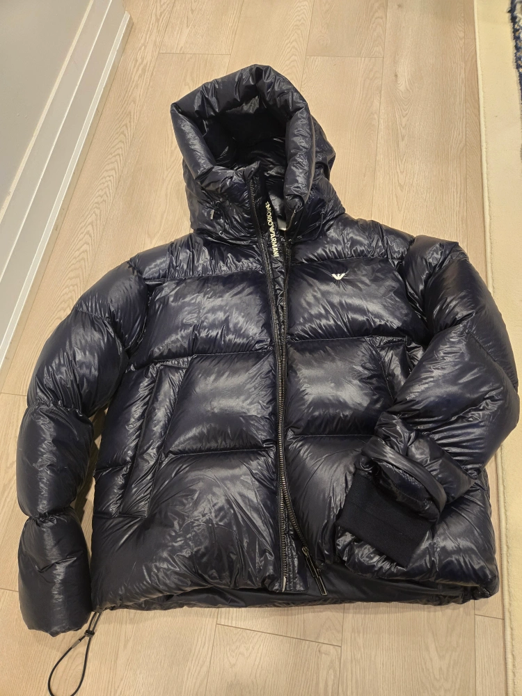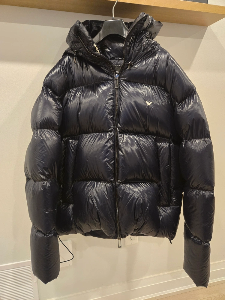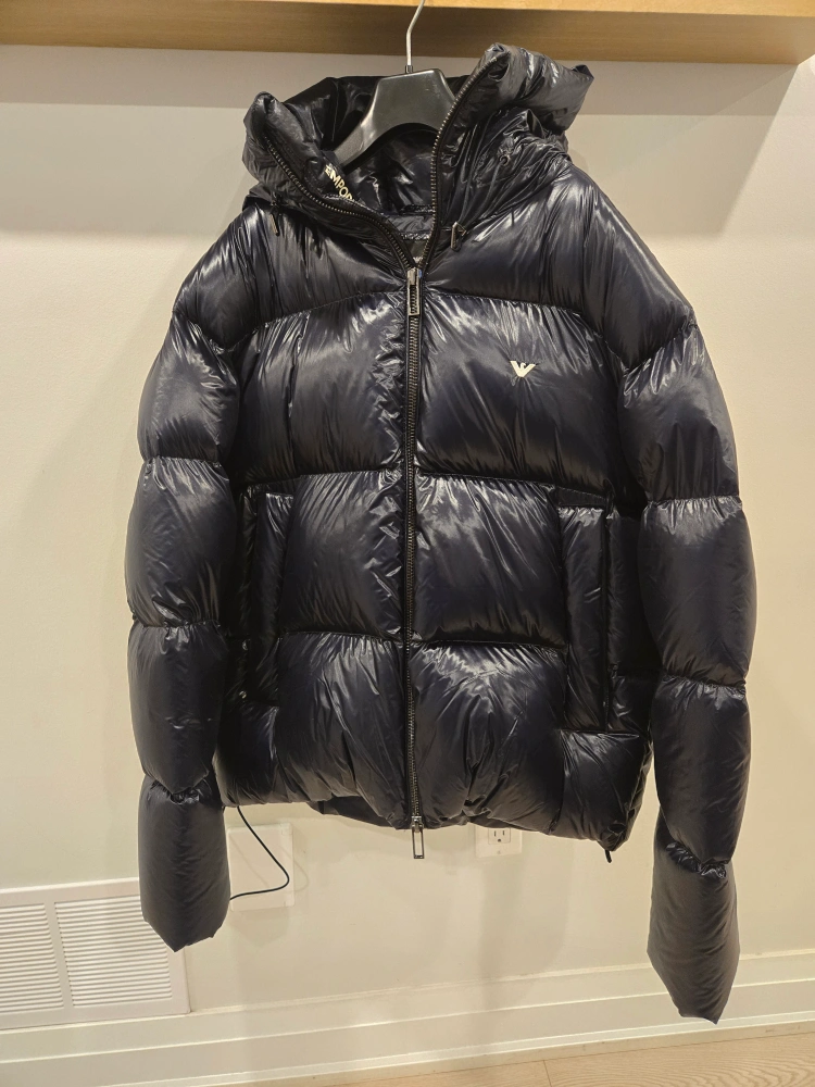 5Stylish Emporio Armani puffer jacket, perfect for staying warm and fashionable! The jacket is made with lightweight polyamide and filled with 90% duck down and 10% duck feather for excellent insulation. It's designed to be both light and comfortable to wear. Purchased from harry rosen and work once.