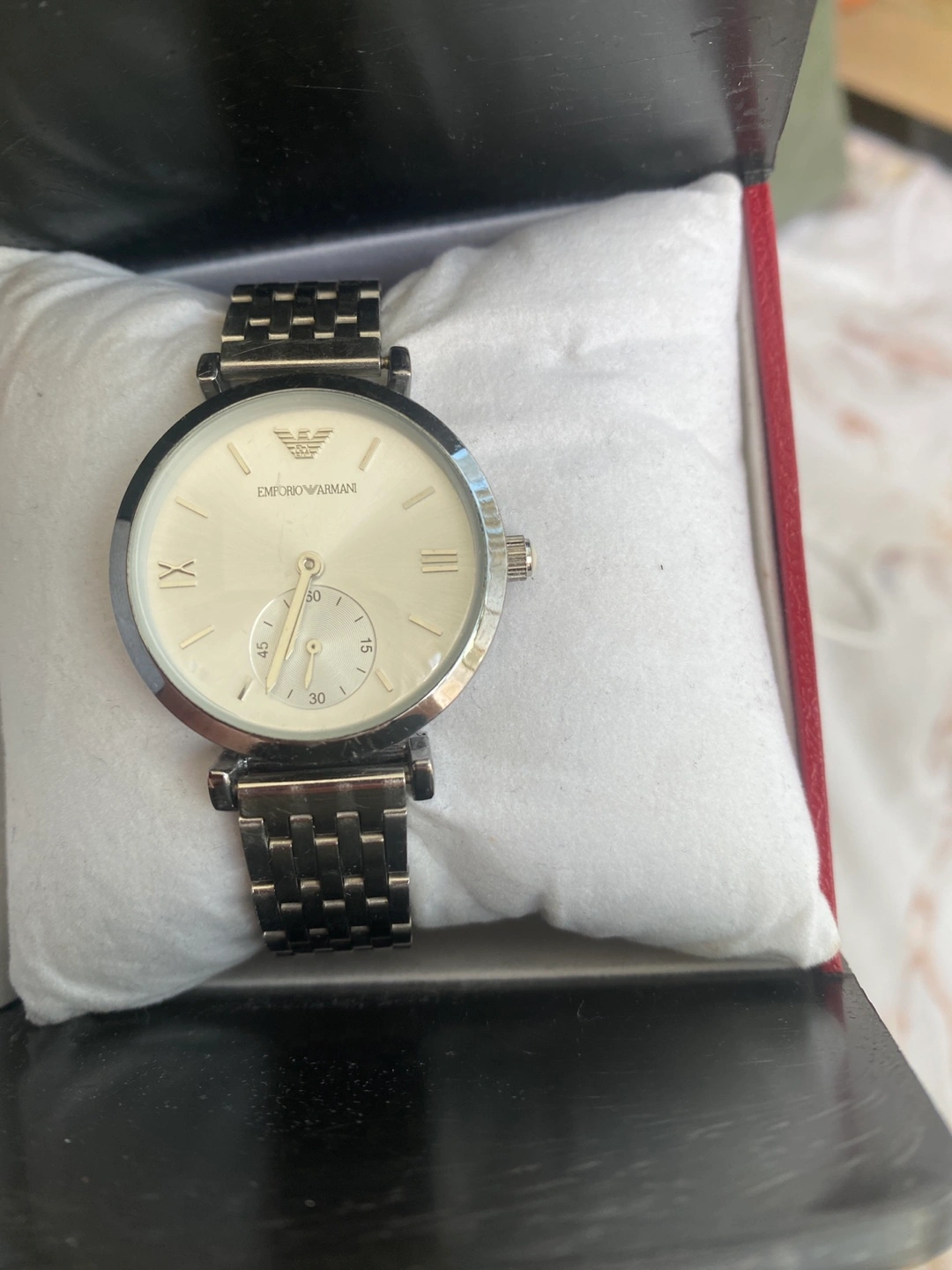 Selling a lovely Emporio Armani women's watch. It features a silver-tone dial and a stainless steel band. Comes in its original box!