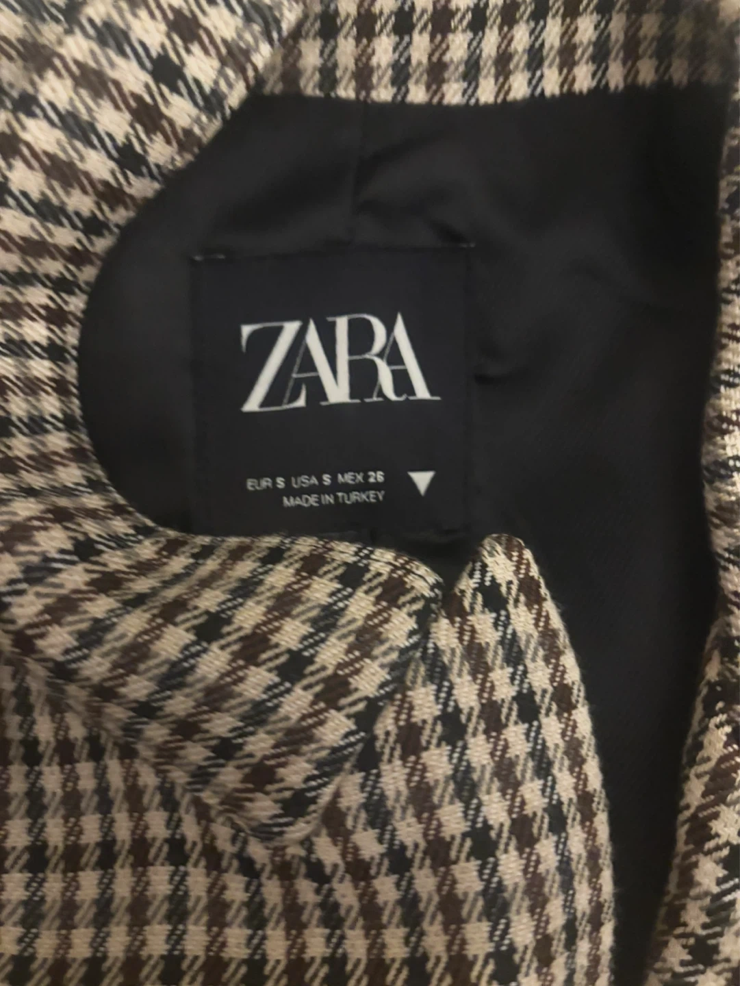 Classic houndstooth pattern blazer from Zara. Double-breasted design with two button closure. This blazer is made in Turkey. Size S. Perfect for adding a polished touch to any outfit!