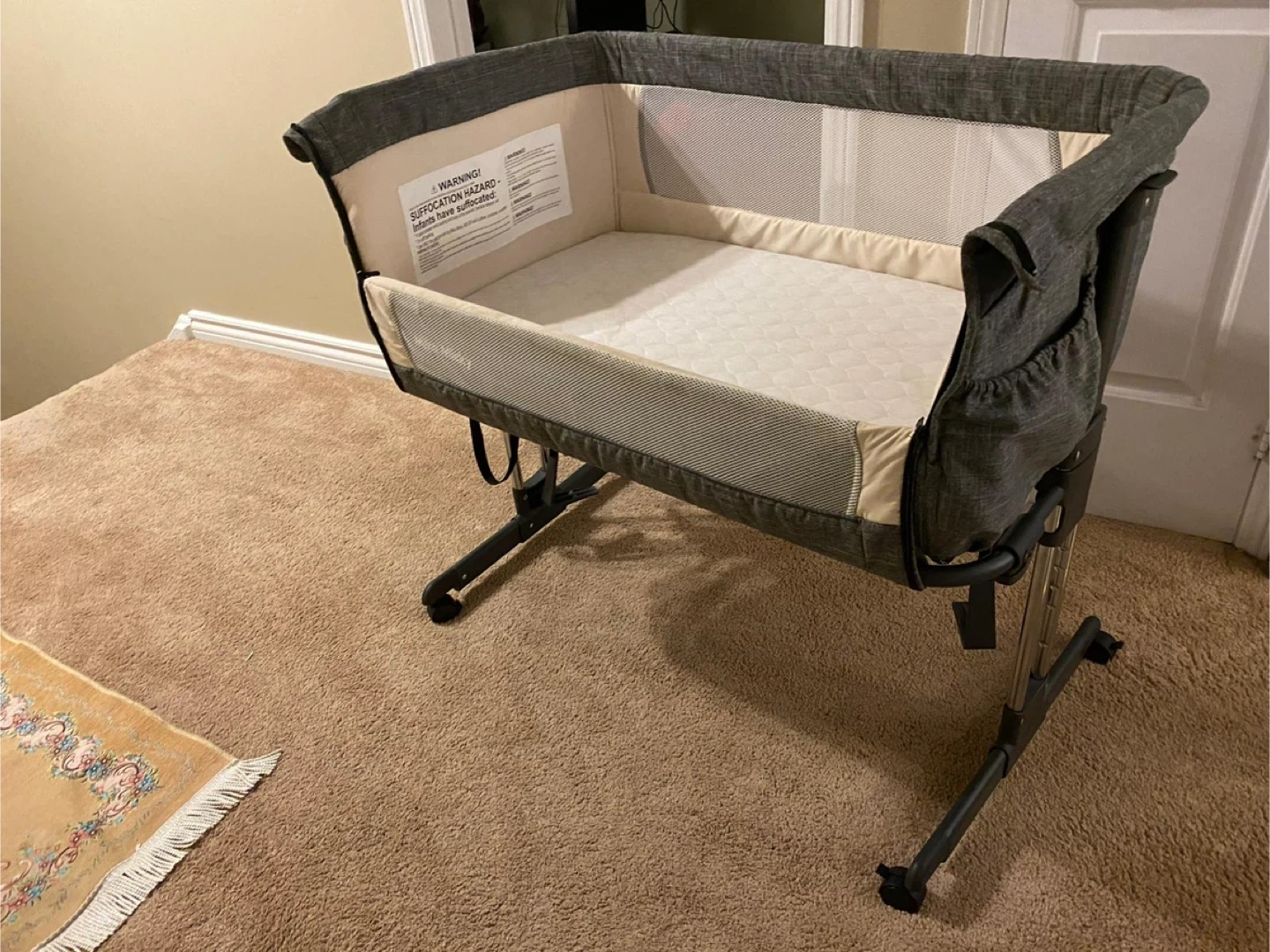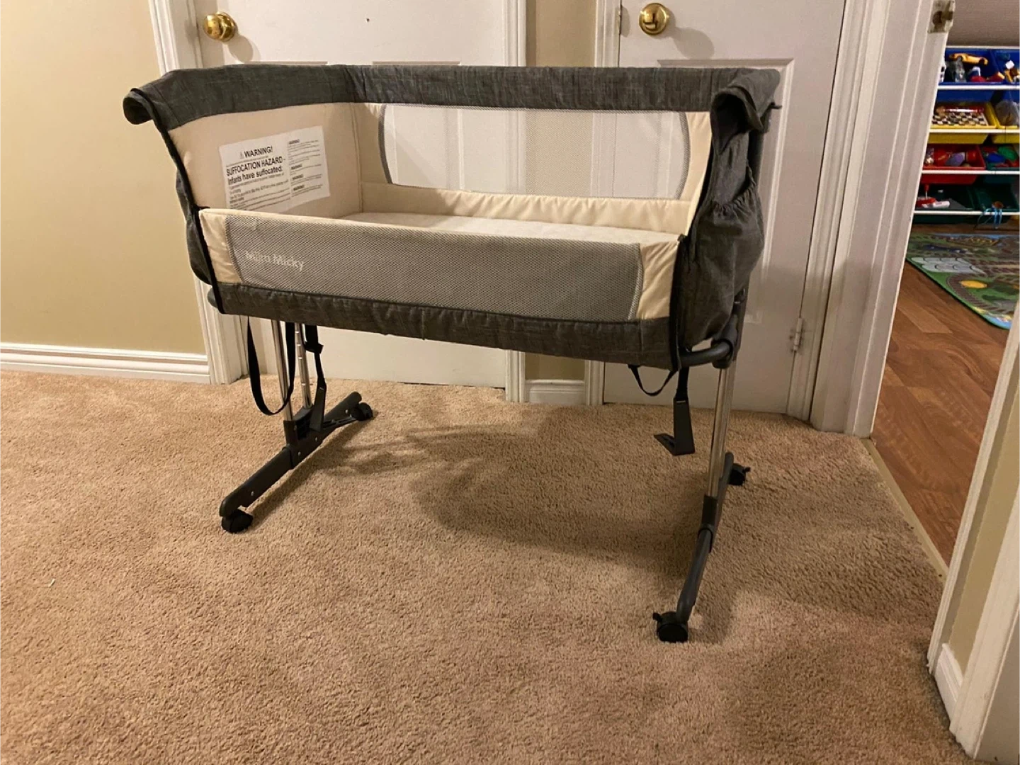 This Mika Micky bassinet is perfect for keeping your little one close by. It features a comfortable mattress and breathable mesh sides for good airflow. The bassinet's frame is sturdy and adjustable, making it easy to position.