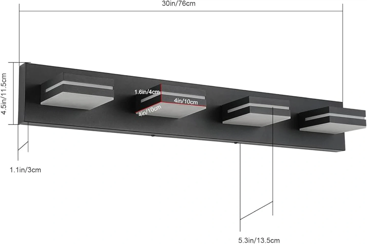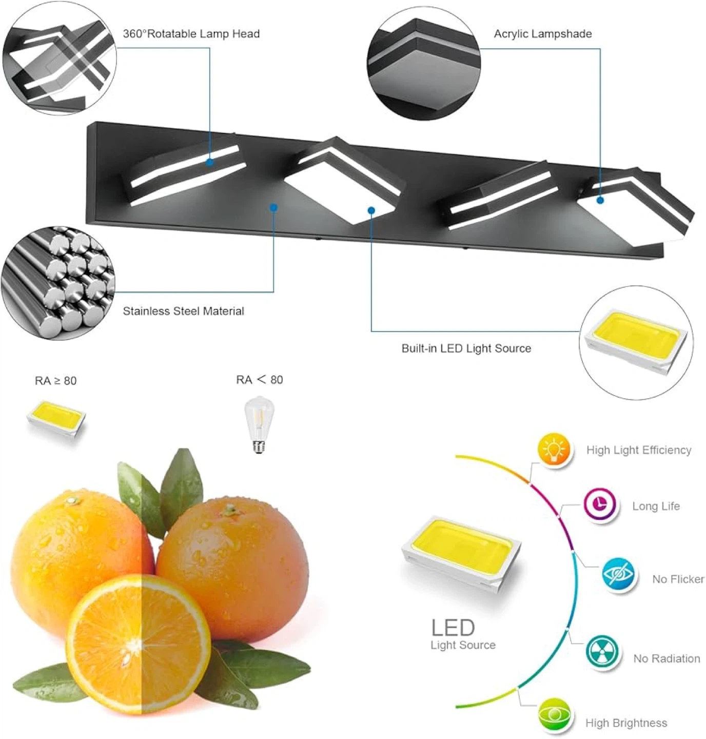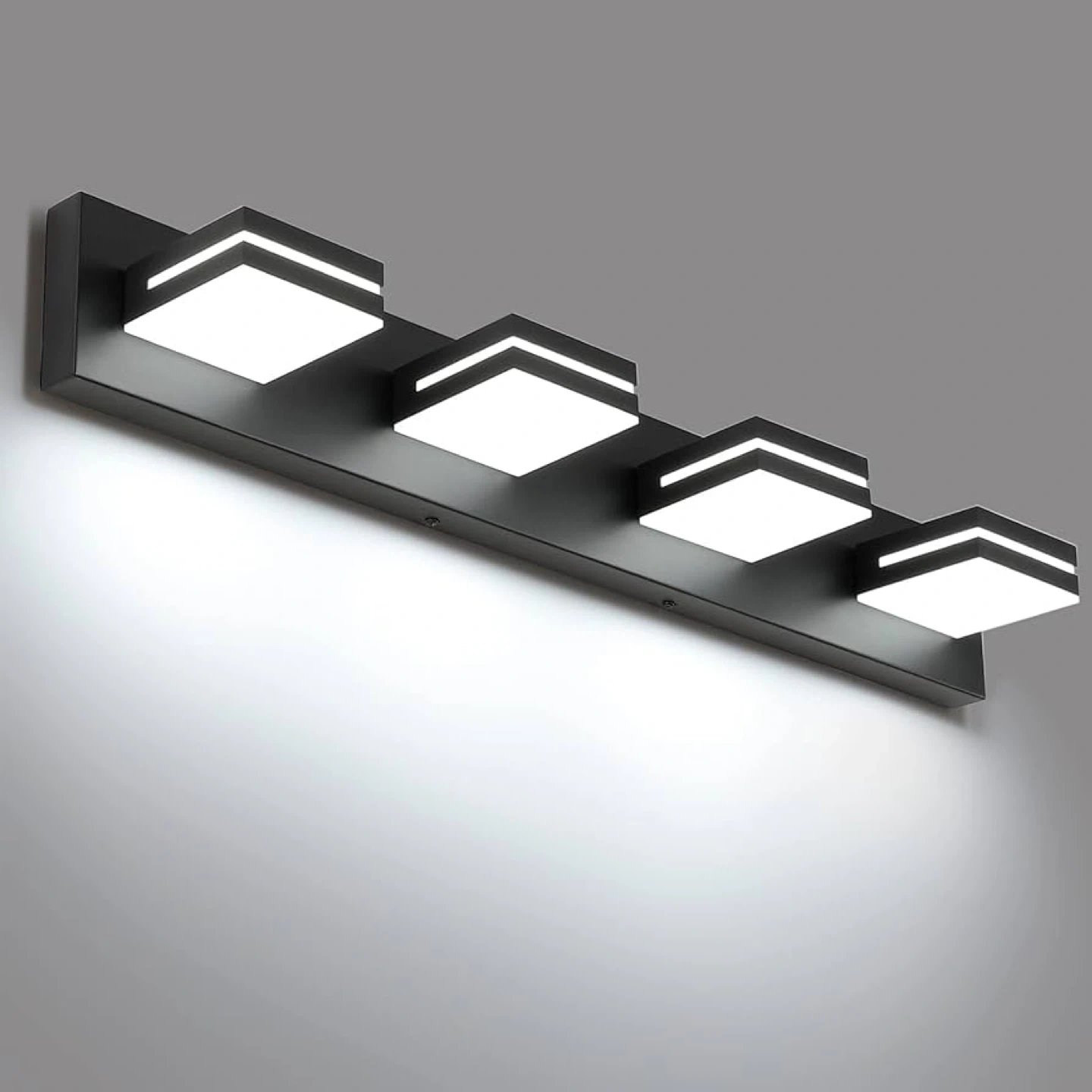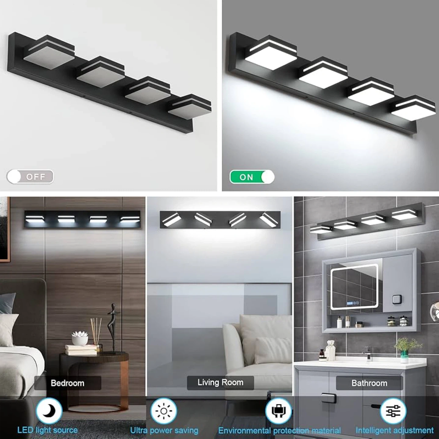 This vanity fixture features four square lights with a modern design. It's made from stainless steel with an acrylic lampshade and has a built-in LED light source. The lamp heads are 360° rotatable.