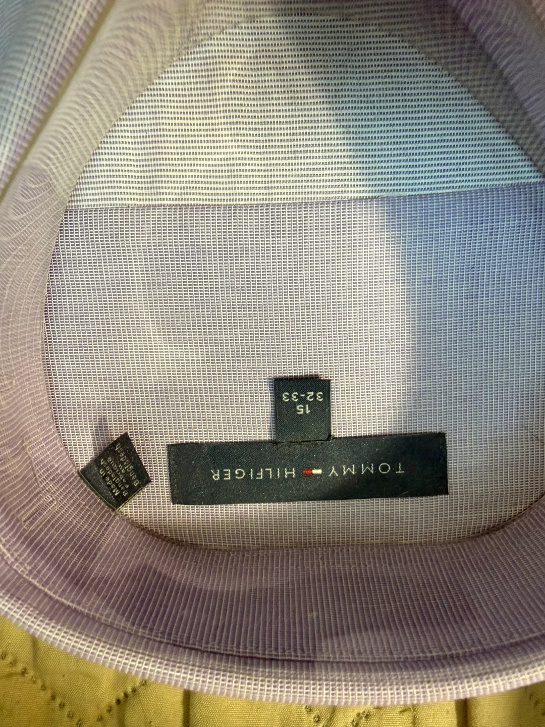 This Tommy Hilfiger dress shirt is a light purple colour. It's a size 15 with sleeves measuring 32-33 inches. Made from a comfortable fabric blend.