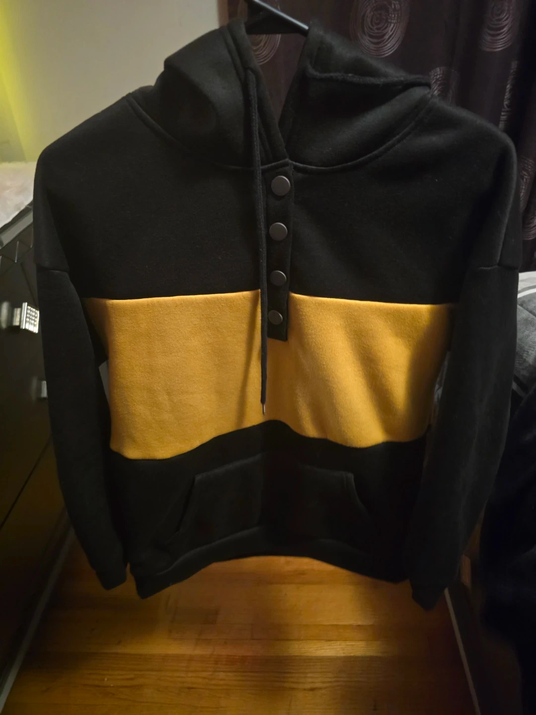 Cozy black hoodie with a yellow color block detail across the chest. It features a kangaroo pocket and a snap-button placket at the neck. Made from a soft, fleece-lined material for extra warmth.