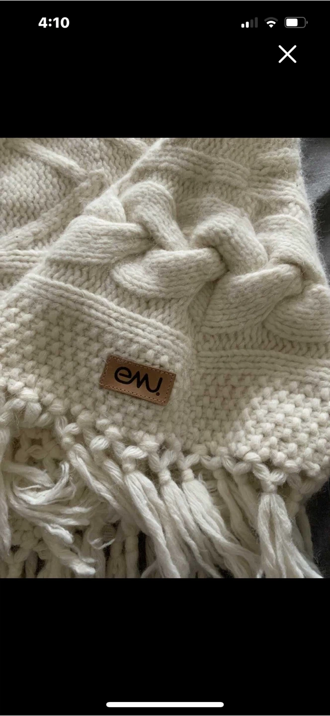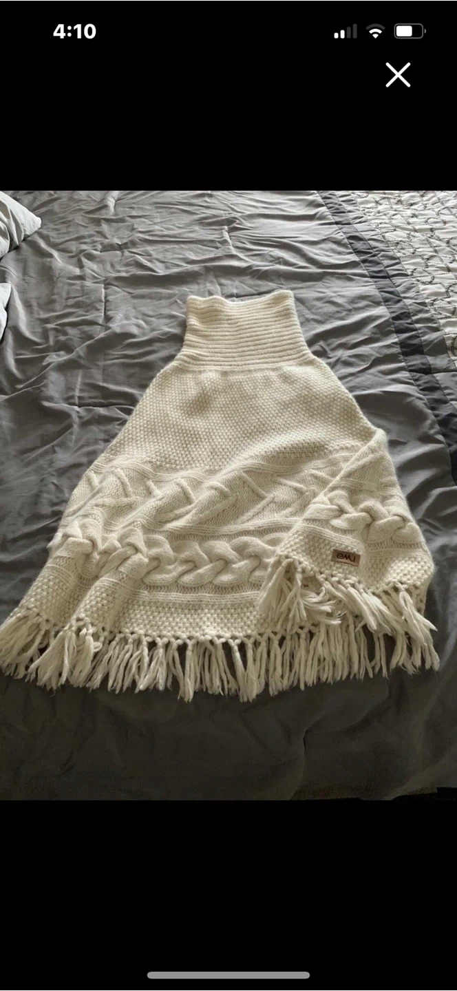 10Cozy up with this Emu Australia knit poncho! It's a beautiful cream colour and features a lovely cable knit design with fringe detailing. Perfect for adding a touch of warmth and style to any outfit.