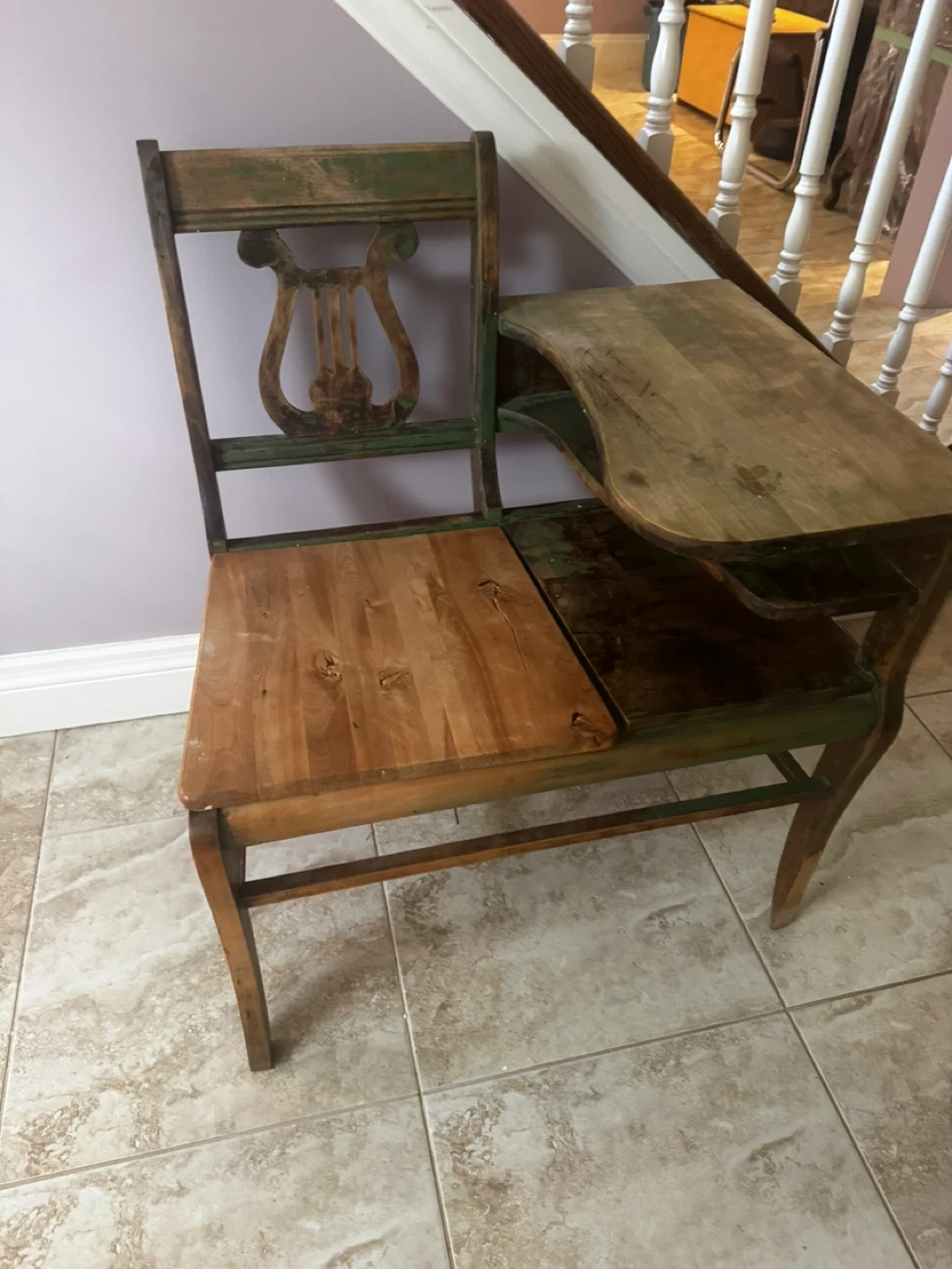This antique chair features a unique lyre-shaped backrest and a built-in writing surface. It's made of wood and has a distinct green and natural wood finish. This piece would be useful for a collector or someone looking for a unique accent piece. Pick up in Acton or drop off in Brampton/Milton