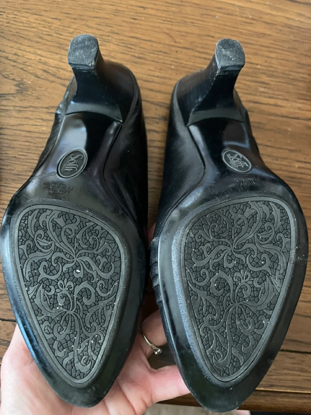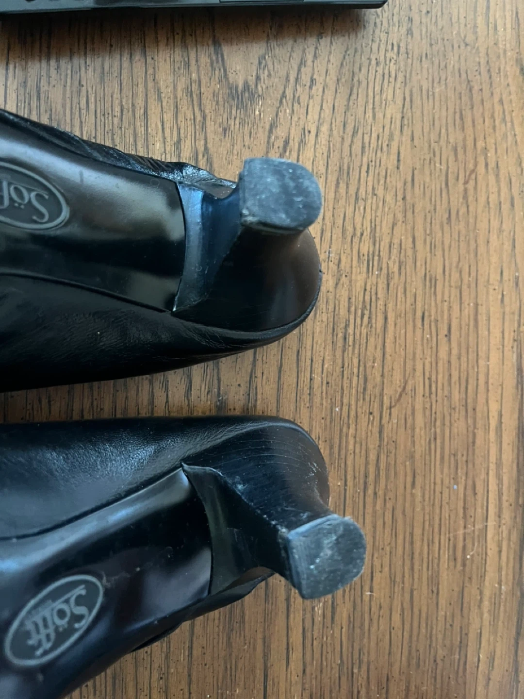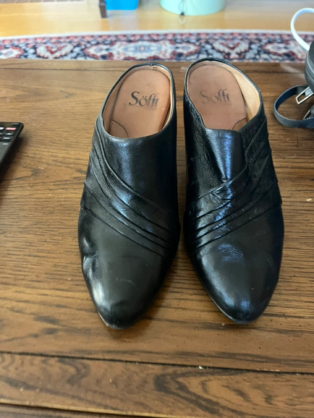 Söffi black leather mule heels. Size 8. These slip-on heels offer a stylish look with a pointed toe and decorative pleating on the vamp. They're made from genuine leather. Heel tips will need to be replaced soonish.