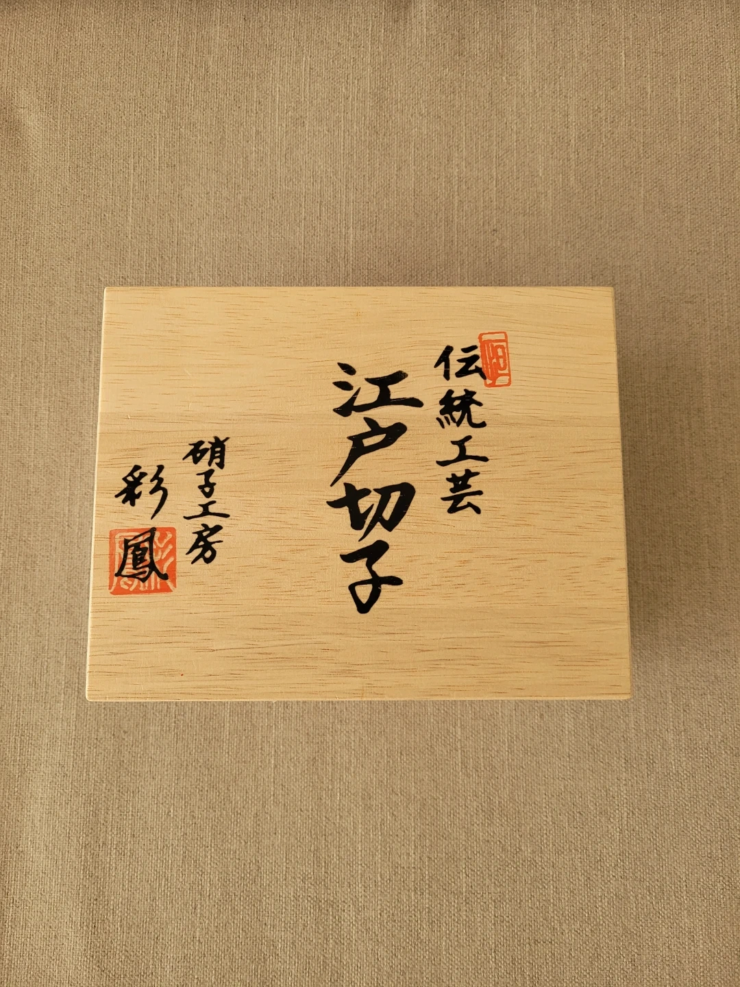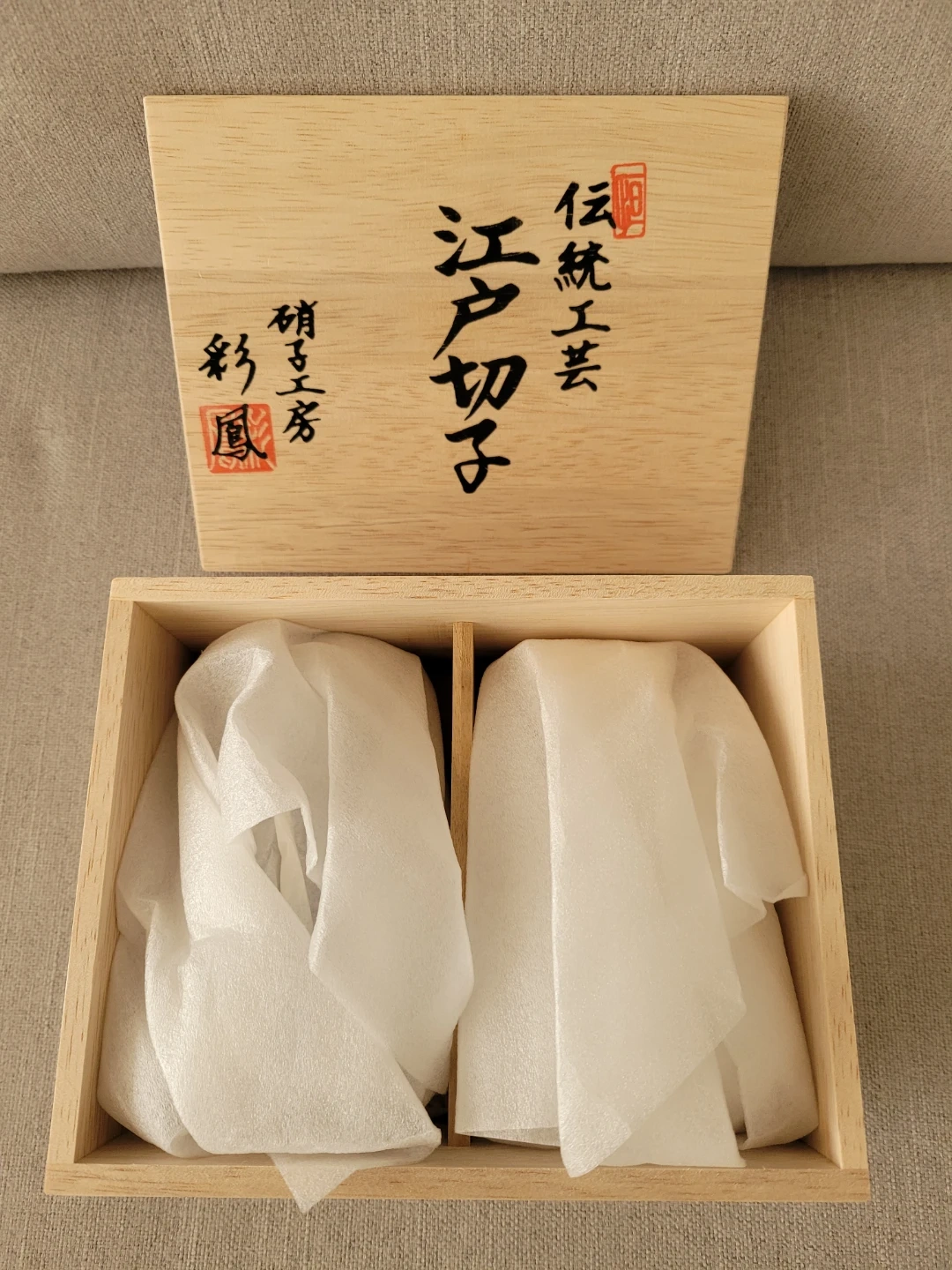 Selling a beautiful set of Edo Kiriko cut glass tumblers! These are in excellent condition and come in their original wooden box. One glass is red, and the other is blue. Each glass is about 10.5cm tall and 7cm in diameter. Perfect for adding a touch of elegance to your home! They're a gift, but I never used them.