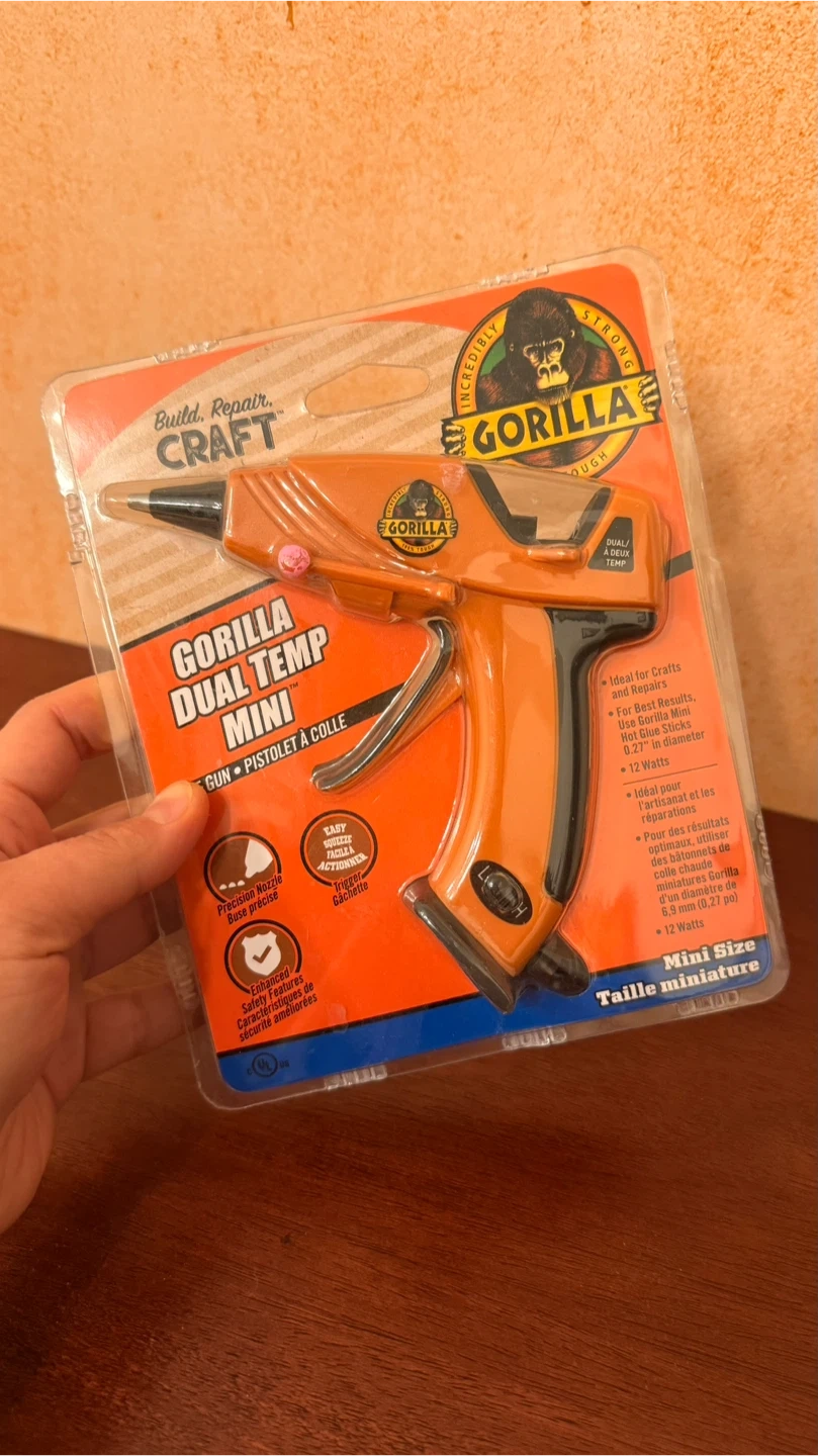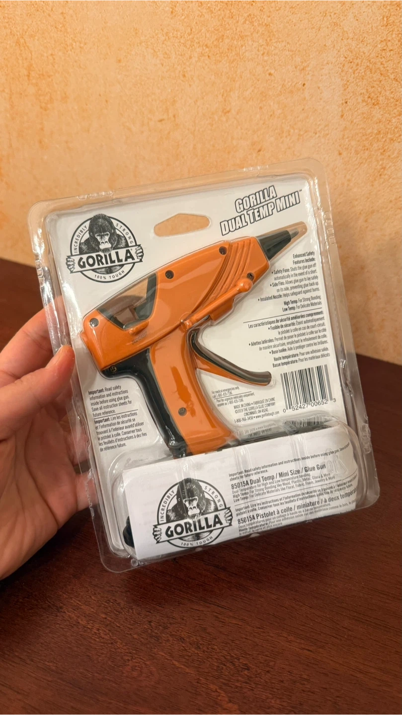 Gorilla Dual Temp hot glue gun. Includes a precision nozzle and a safety fuse.