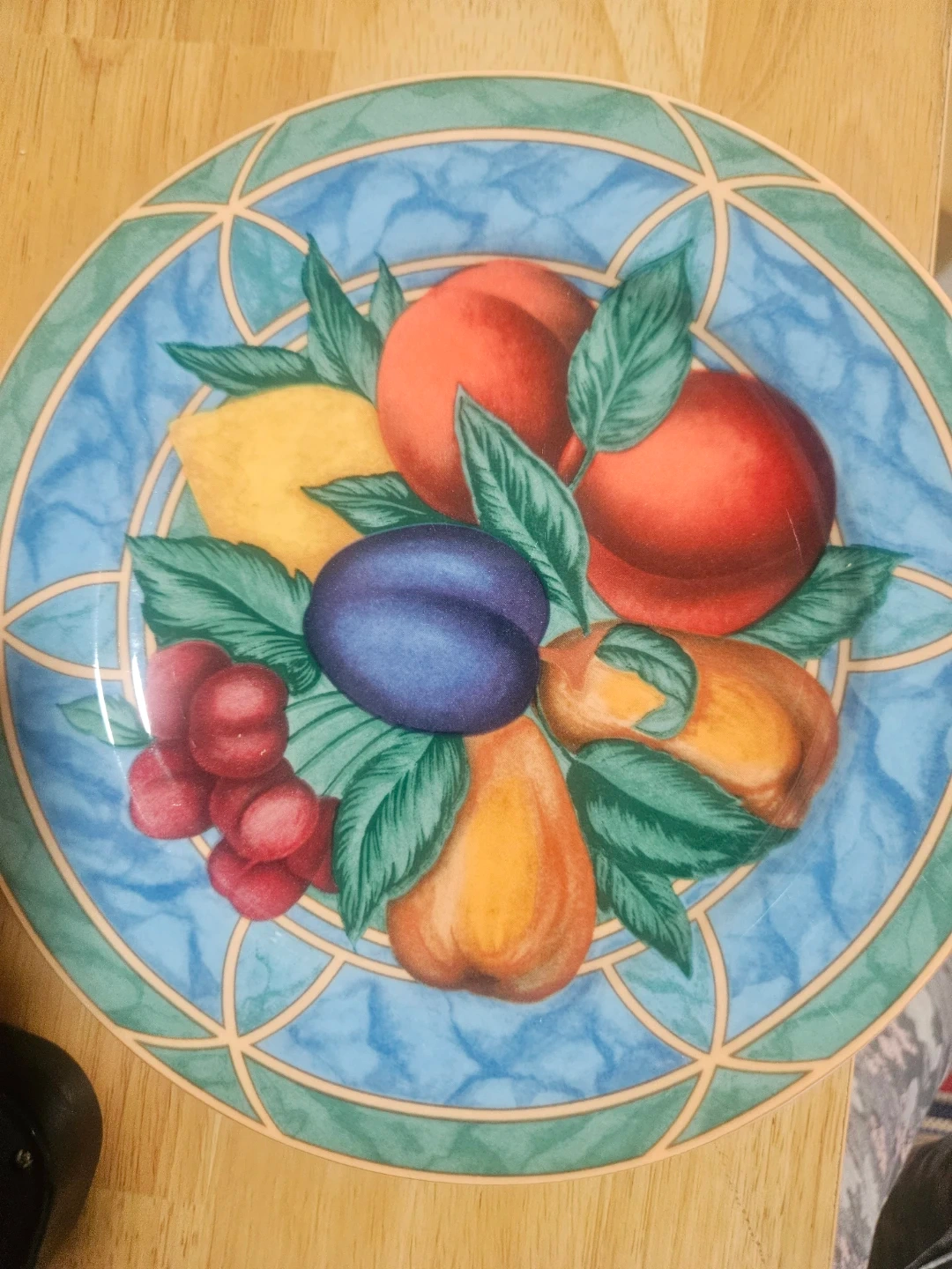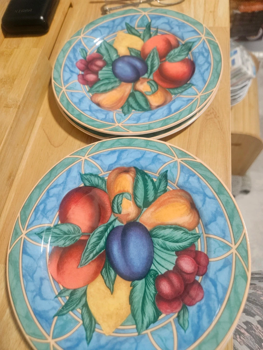 Set of four Victoria Beale Forbidden Fruit 9024 plates. These fine translucent porcelain plates feature a colorful fruit design. They're microwave and oven safe and made in Indonesia.