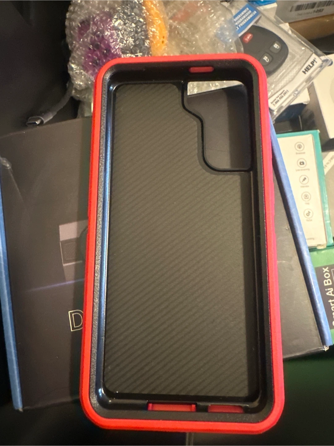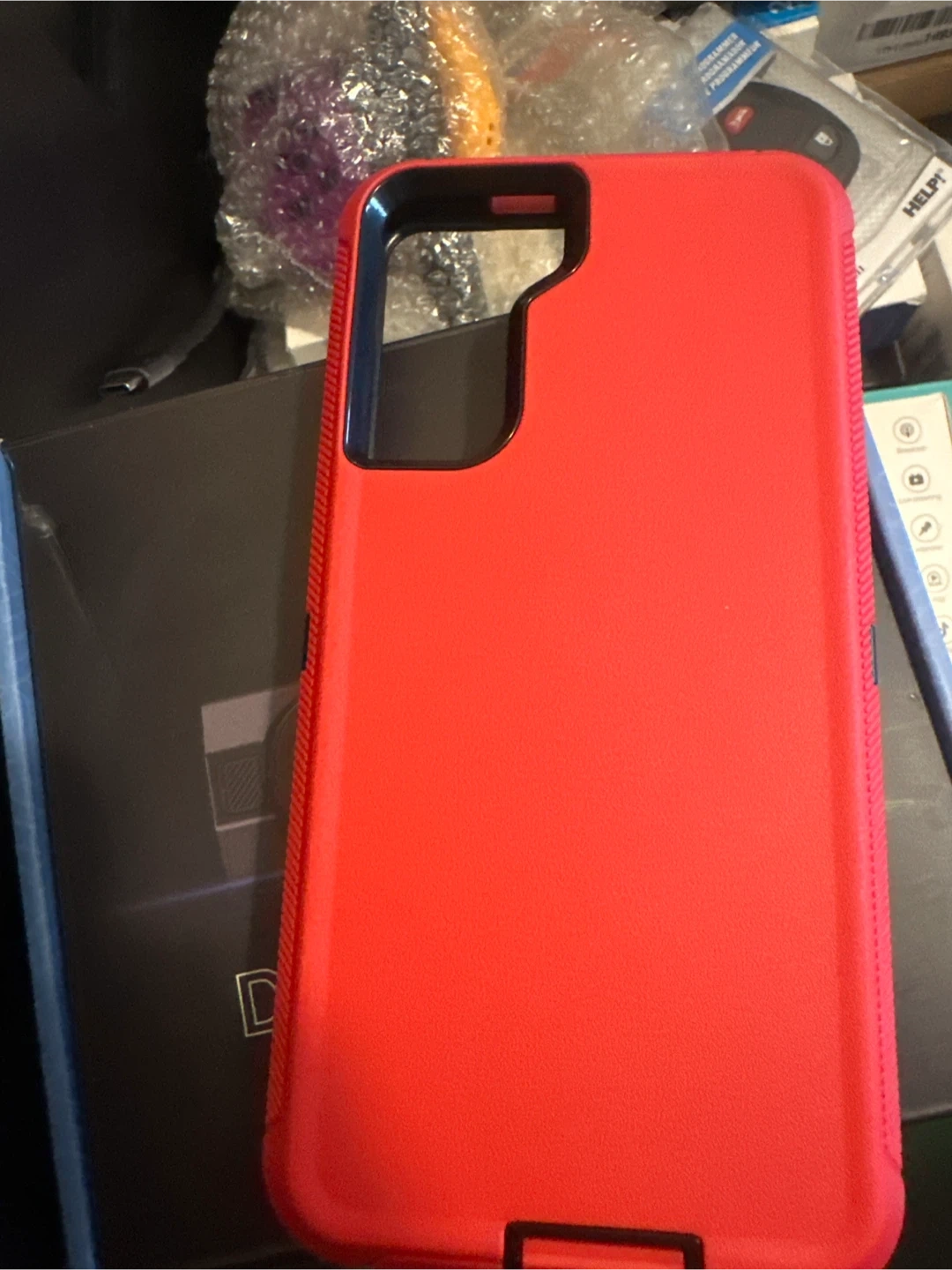 This is a red phone case for the Samsung S21 Ultra. It offers a durable construction with a textured grip. The case has precise cutouts for ports and buttons.