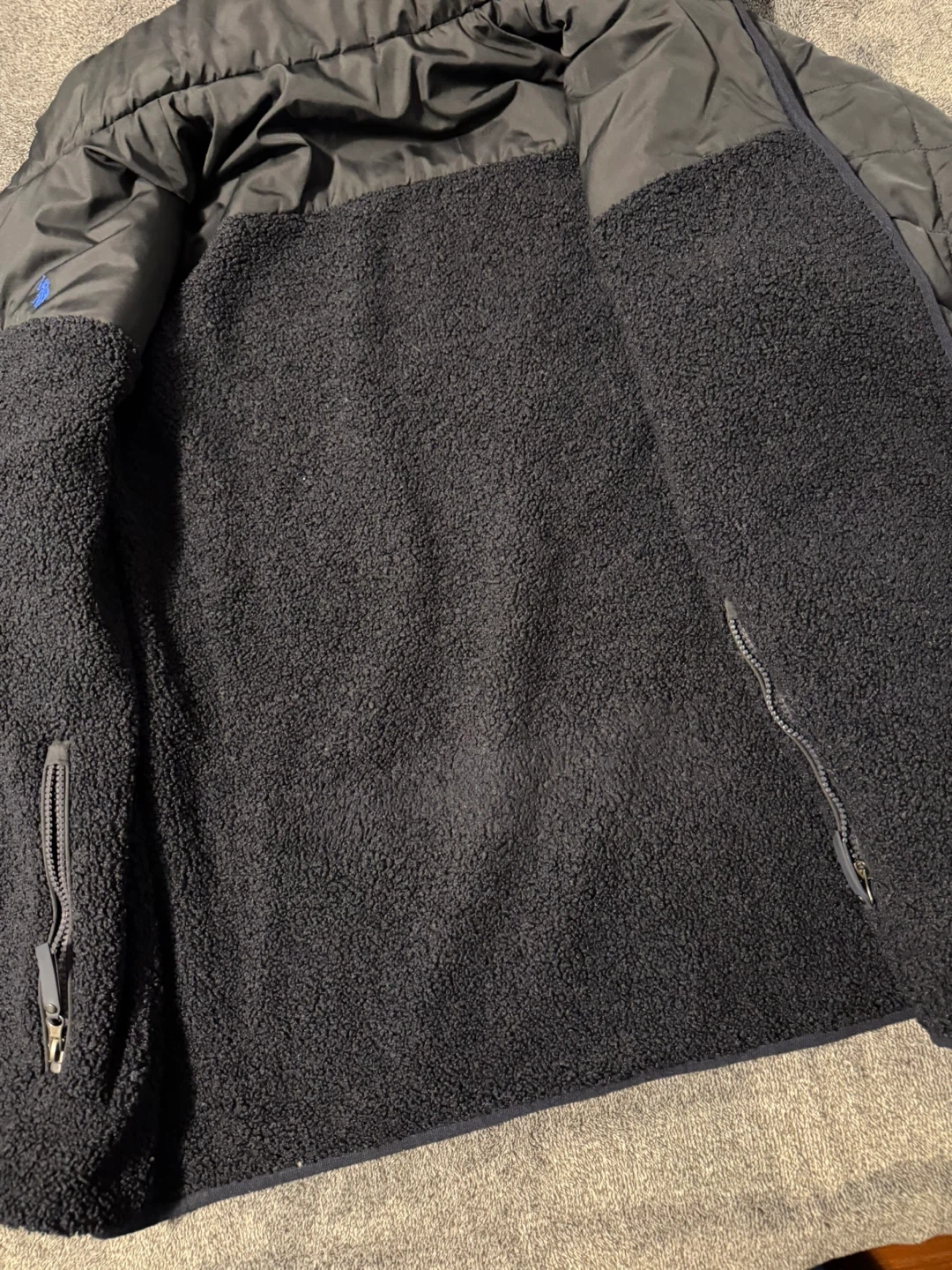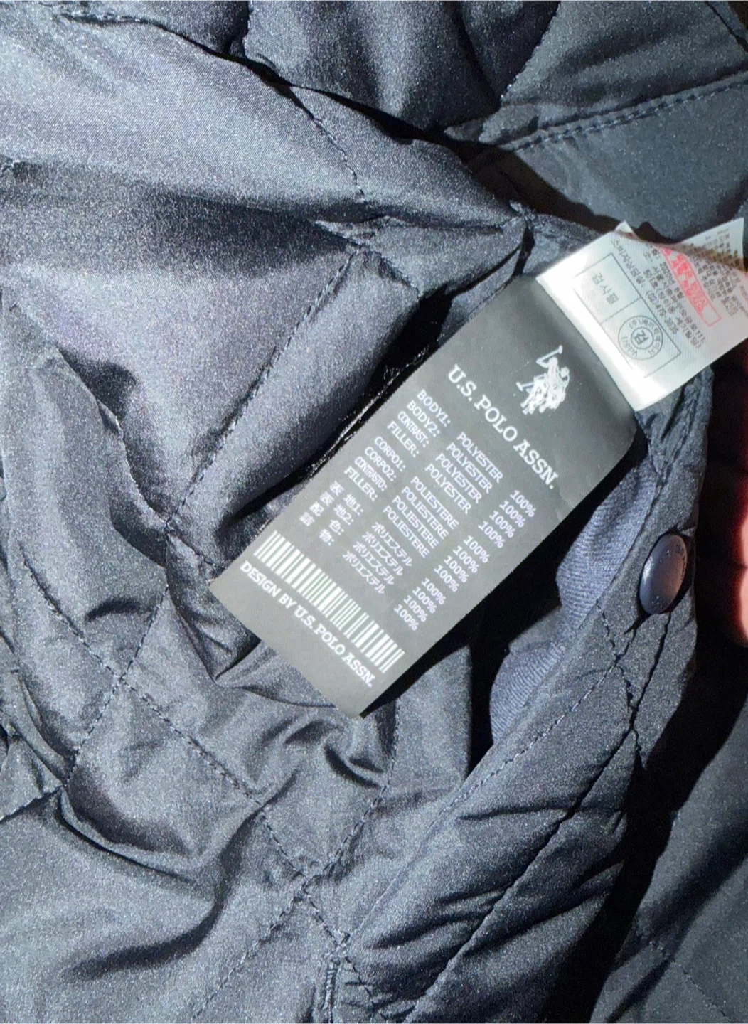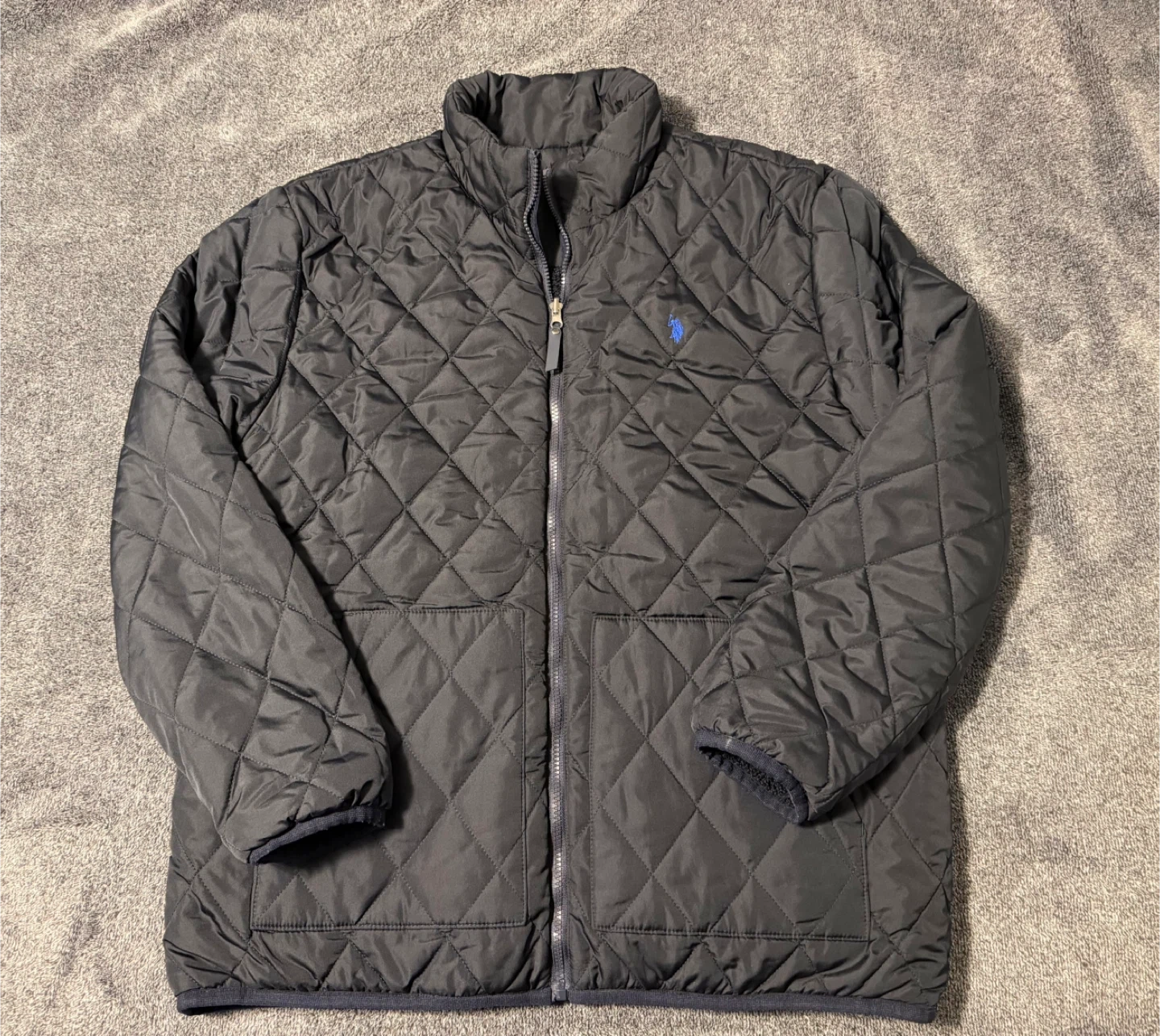 This is a U.S. Polo Assn. quilted jacket with a fleece lining. It features a full zip closure and two front pockets. It's a great layering piece for cooler weather!