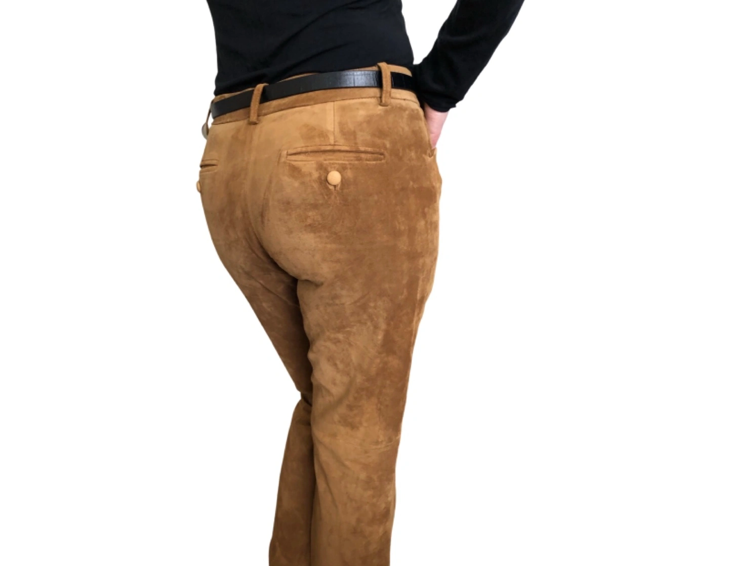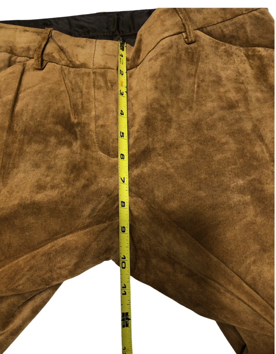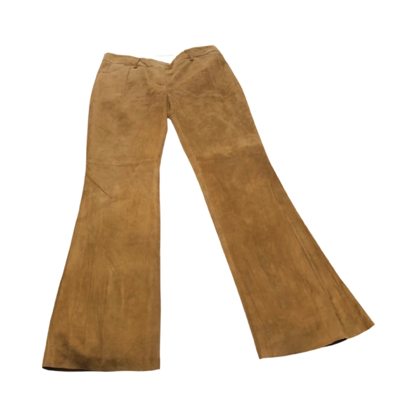 These tan suede flare pants are fully lined and very soft and comfortable to wear. They are mid-rise, and have a straight leg with a slight bootcut. Made from washable suede (hand-wash and line dry).