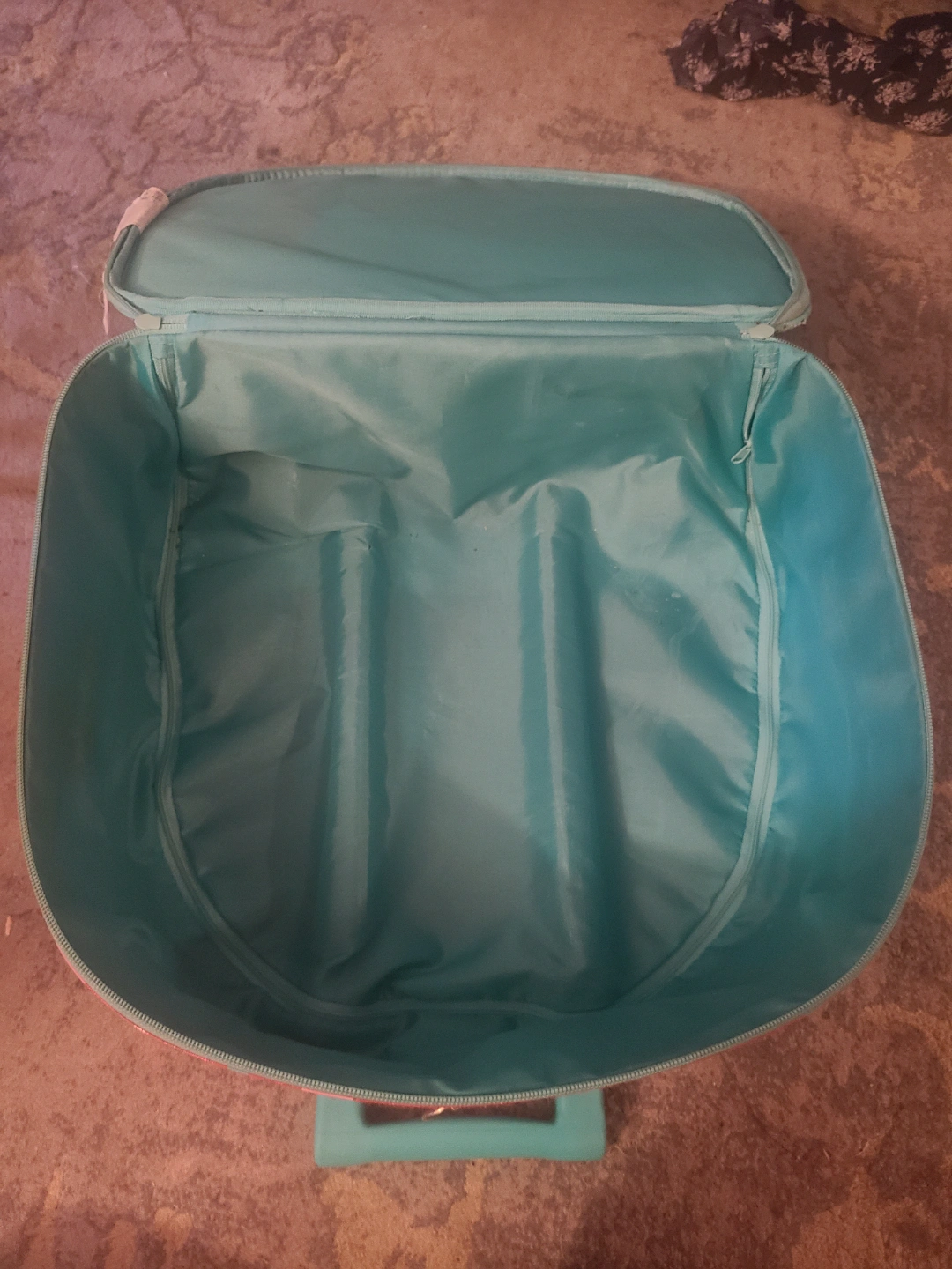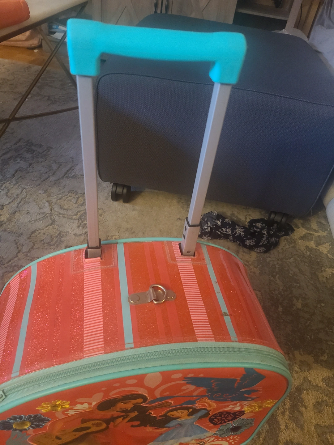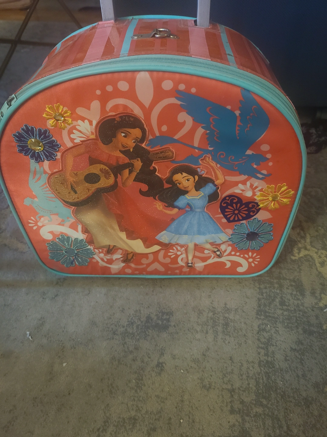 37Adorable kids' rolling suitcase. Features characters from Disney's Encanto. Teal and coral colours. Small size, ideal for children. Pull-up handle.