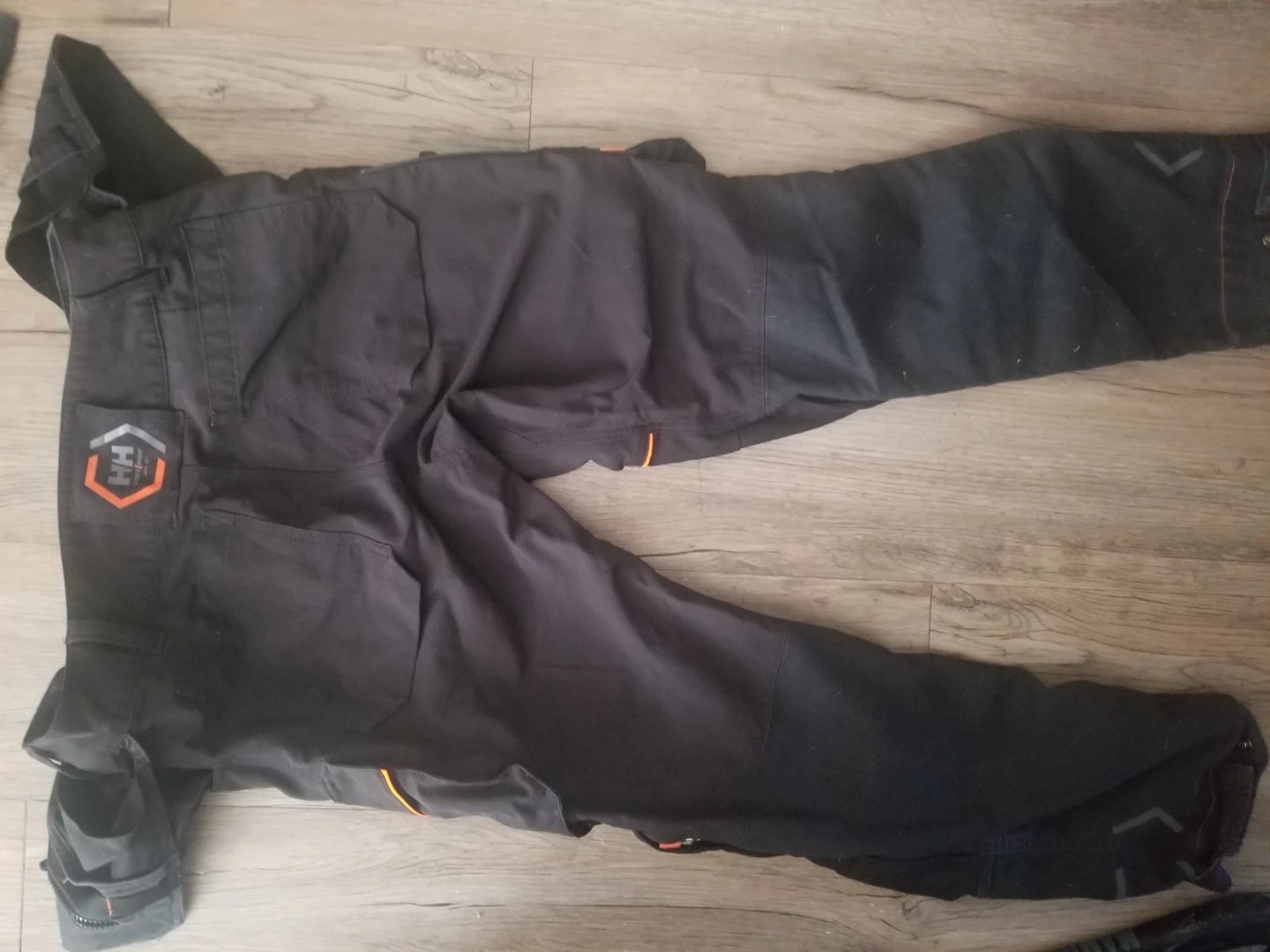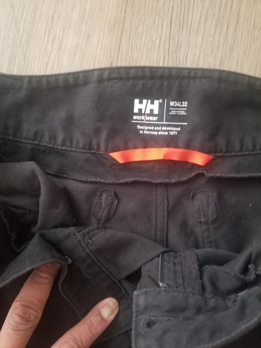These are Helly Hansen work pants in black. Size W34L32. They're designed and developed in Norway since 1877. These pants feature multiple pockets for utility.