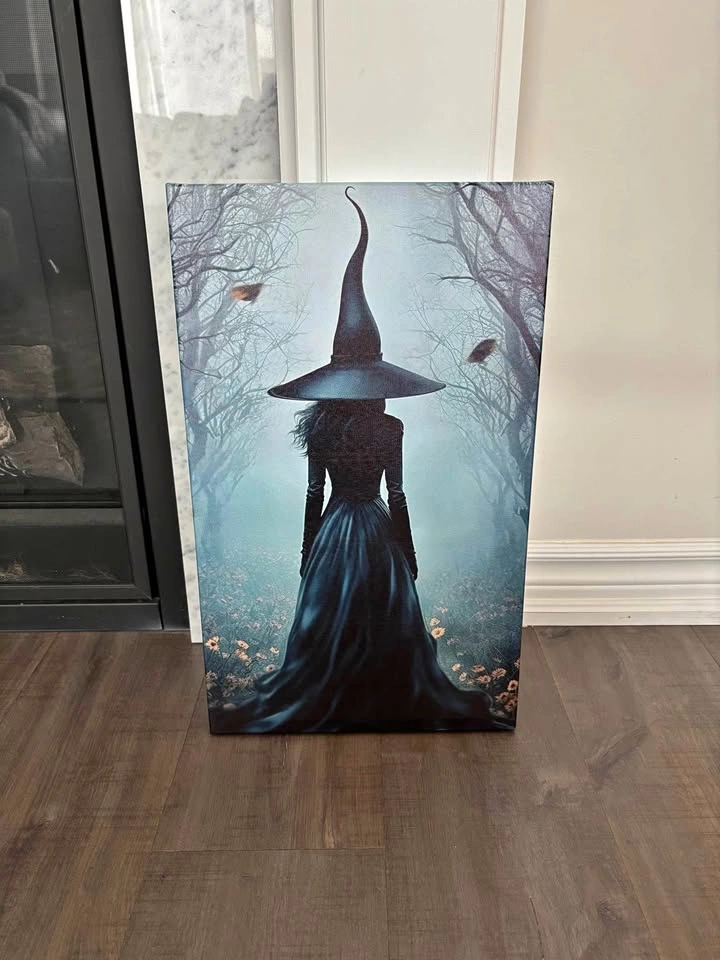 Enchanted forest witch print on canvas. Framed (by me) onto 19.6”X11.7”X1.5” wooden frame. Light weight and ready to hang with sawtooth hanger attached. Pick up in North Bowmanville near Northglen Blvd.