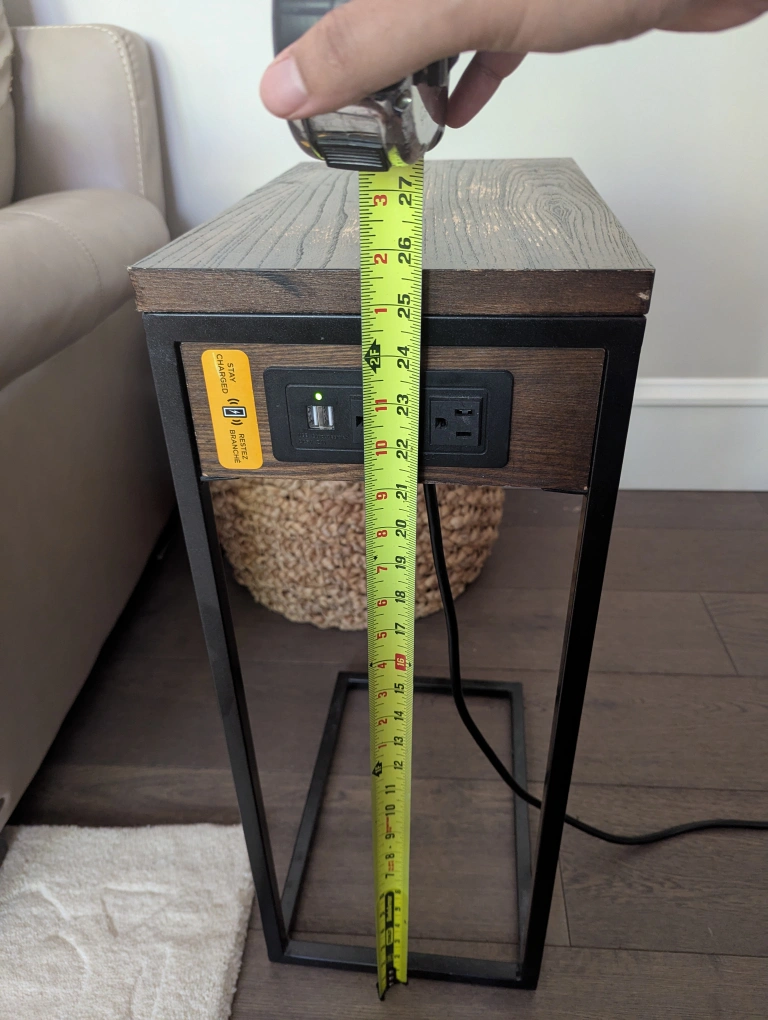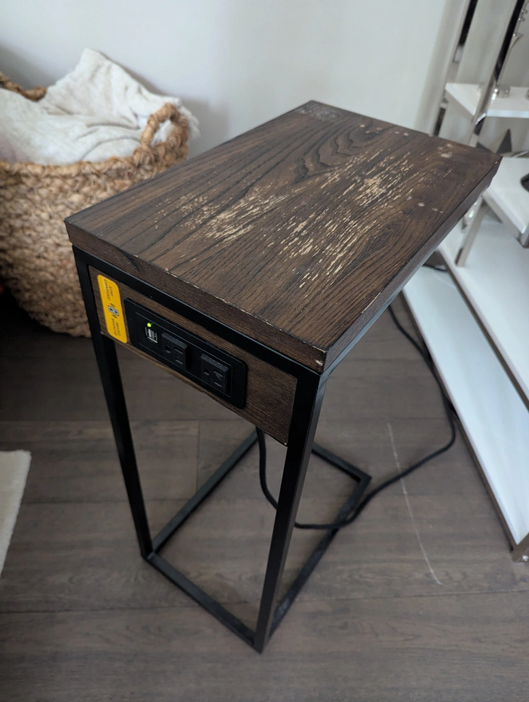 This end table features a built-in USB charging station, perfect for keeping your devices powered up. It's a stylish and functional addition to any living space. The table has a dark wood top and a black metal frame. Pick up near 80th & 112th Delta