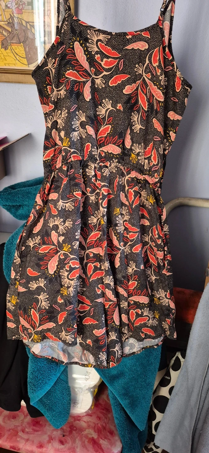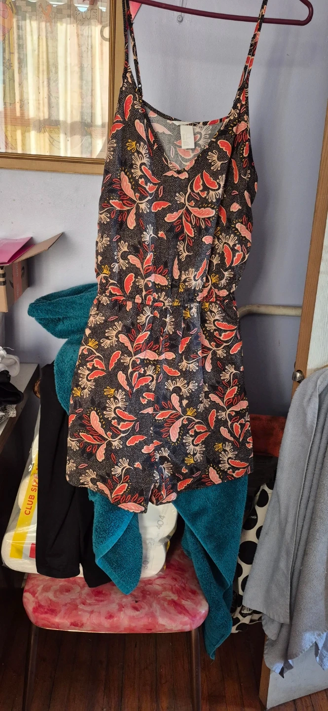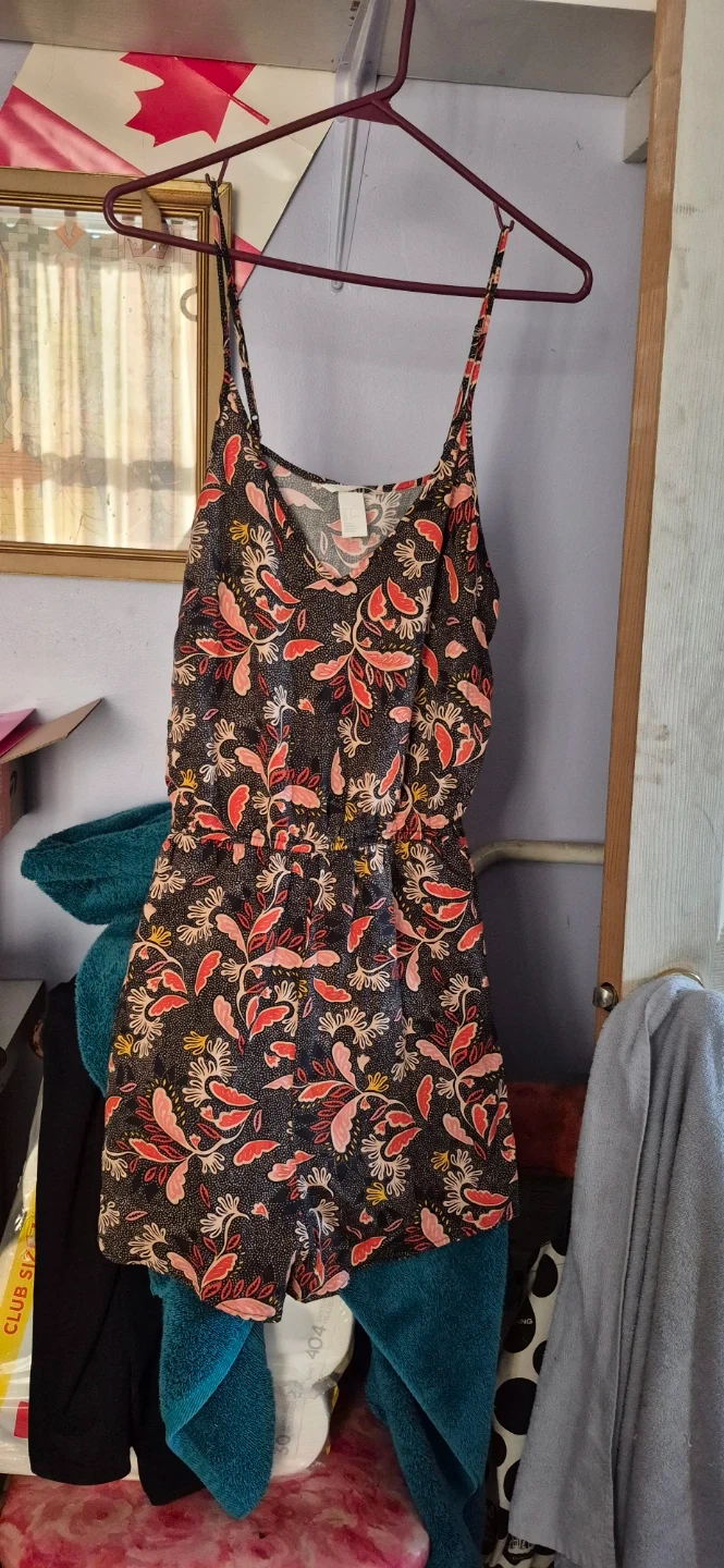 Cute H&M romper with a fun floral pattern! It's a size 8. Pre-owned, side pockets. in great condition. No tares, rips. Kept well. 💯 % Viscose Rayon fibers - which is Cynthetic Silk.