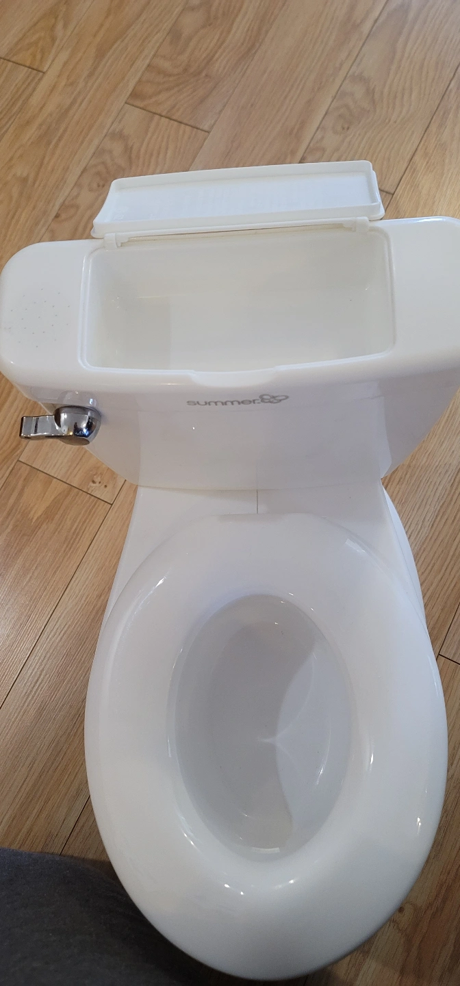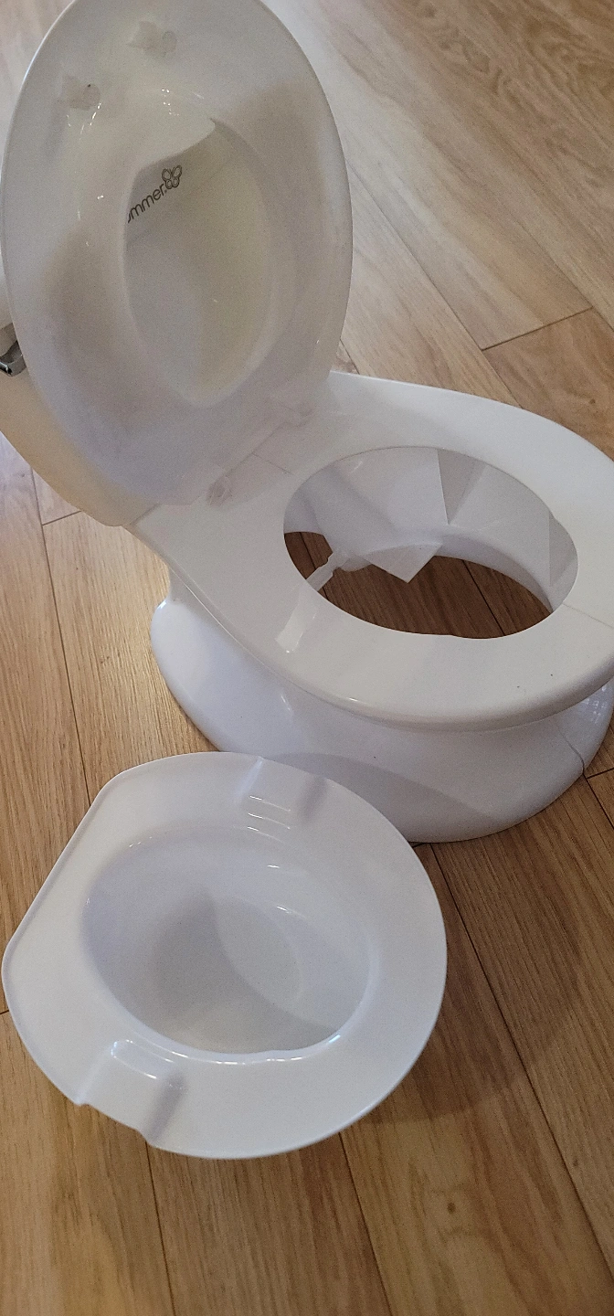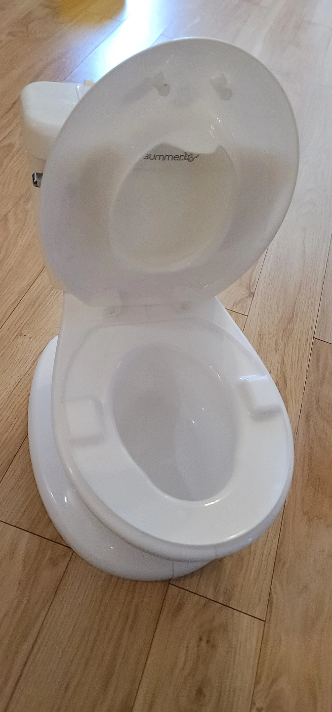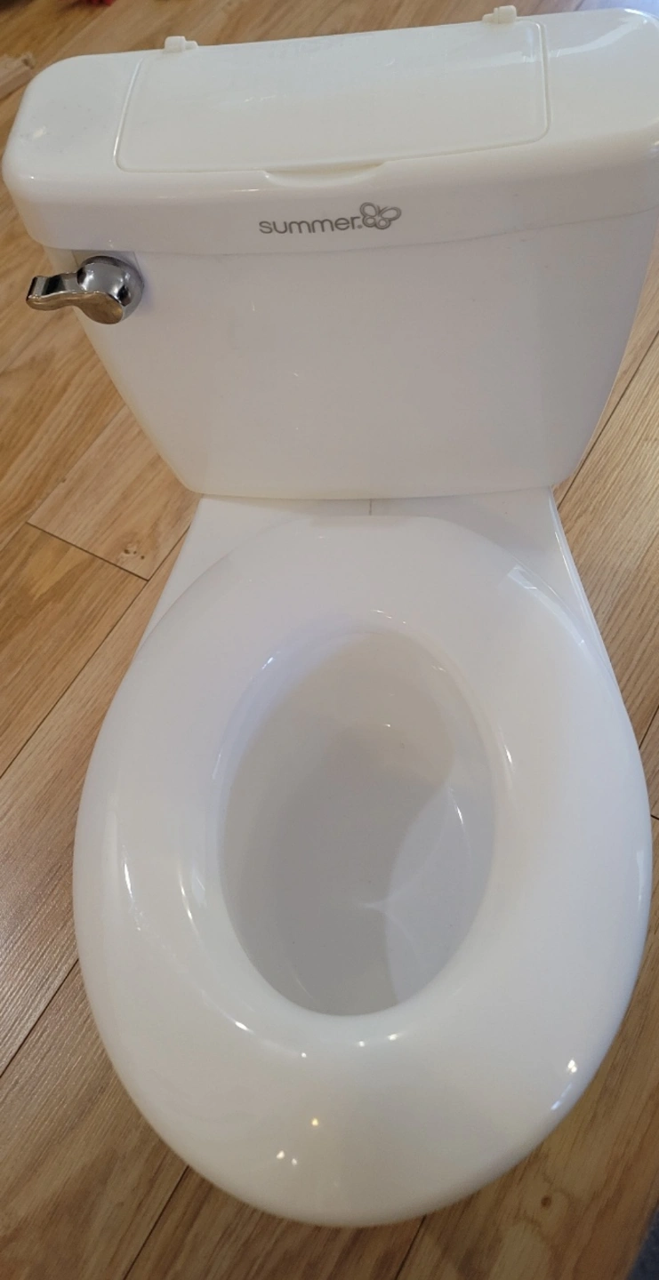 summer white plastic potty. Features a removable bowl for easy cleaning. Designed to look like a real toilet. Great for potty training.