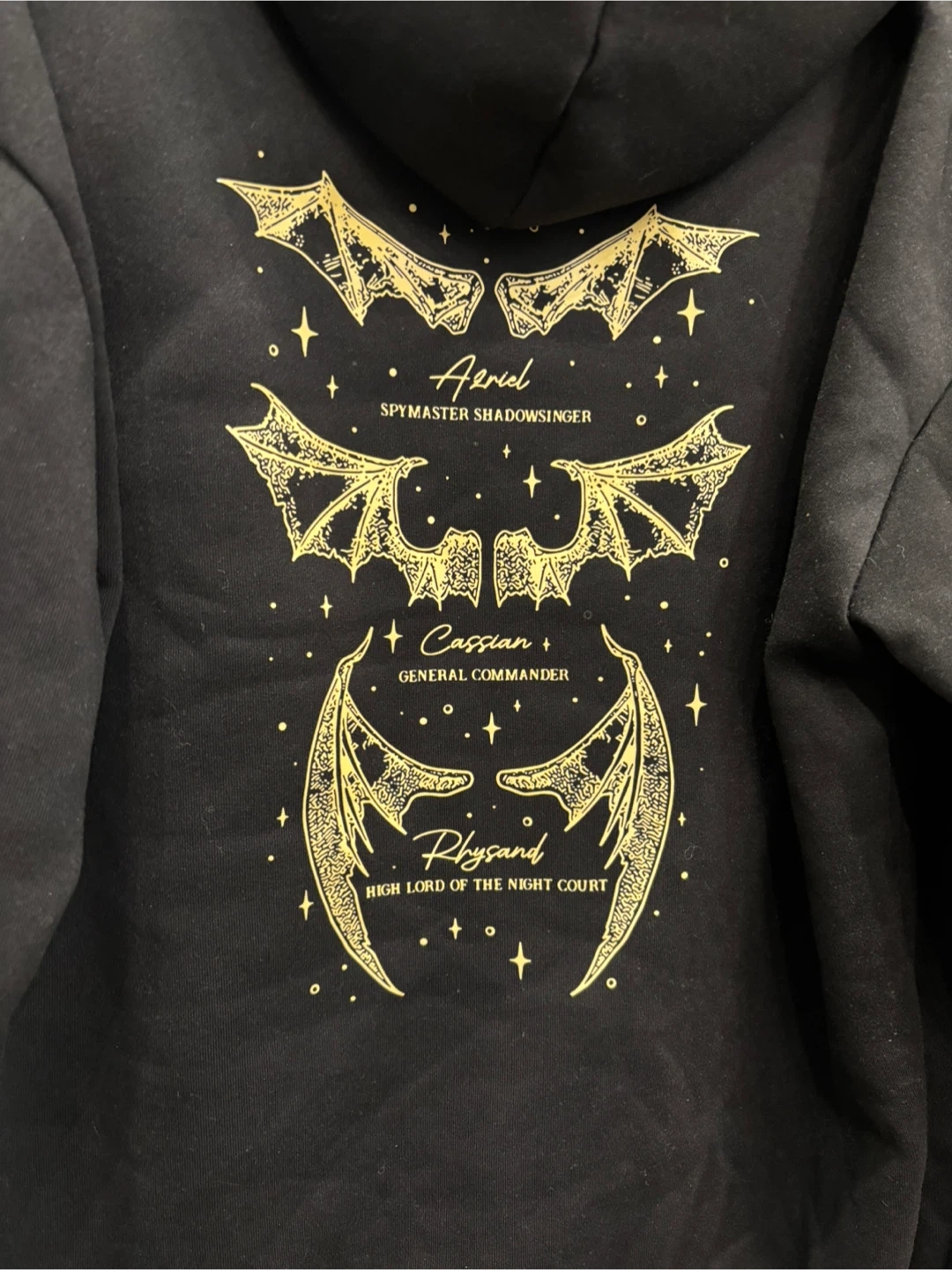 Black hoodie with "The Bat Boys" graphic and wings design. Features Rhysand, Azriel, and Cassian on the front and back. It's a cozy sweatshirt for fans of the series! Size Large